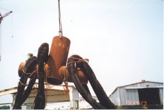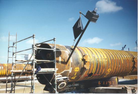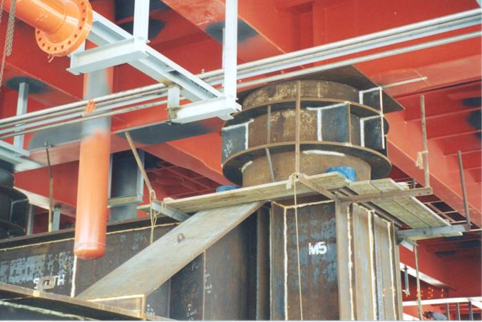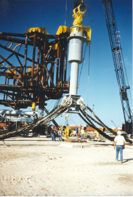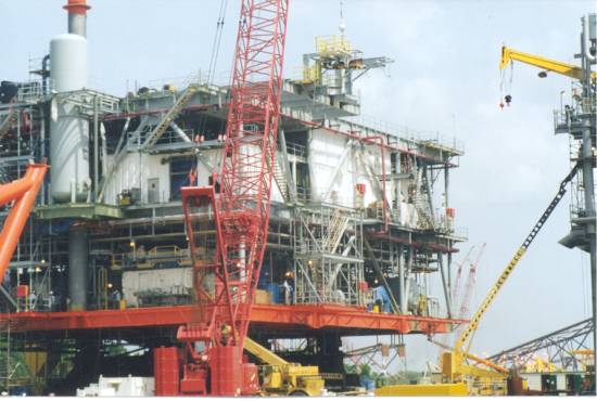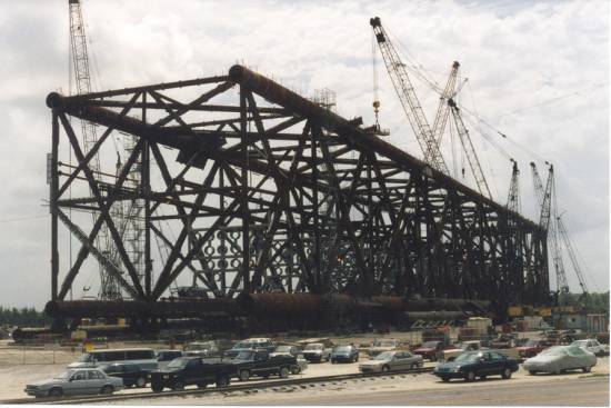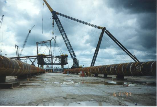 My main role on the project, however was to plan the installation of the two huge topside modules (the North Deck Module and the South Deck Module) atop the completed tower sections. At the onset of the project, few people believed that both modules could be lifted by the DB50 crane alone. It was believed that a dual crane lift would need to be planned for the NDM as the projected weight and center of gravity were at the limits of the DB50's 4400 short ton capacity crane. After much verification of the weights and rigging calculations, both modules were to be lifted by the DB50 alone. The lift of the heavier of the two, the NDM went off without a hitch. Helicopters flew overhead videotaping the lift on a crystal clear day in early December of 1998. The mood aboard the DB50 was relief afterwards. We seemed to be over the hump of the lift that everyone was concerned about. If we could make the heavy lift with such ease, surely the lighter lift would go equally as well. This was not to be. Around ten hours later, after repositioning the DB50 to the other side of the platform, we attempted to lift the SDM. Shortly after lifting the module about 30' off the transport barge, one of cables on the DB50's crane broke and the module fell striking the transport barge and rolling into the stern of the DB50 before sinking to the bottom of the Gulf. Thankfully there were no serious injuries that night.