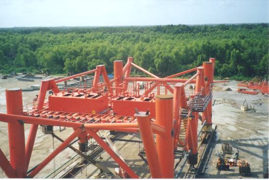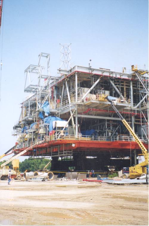 This was a very challenging project from many aspects. Technologically, this was the first time that a structure like this was EVER built and installed. Simply fabricating this platform lying on its side in the JRM Fabrication Yard in Morgan City proved to be a challenge. Then, the task of transporting the two tower sections out to the Gulf of Mexico through the narrow, winding bayous of south Louisiana had to be planned out. I was heavily involved in planning the tows to location. The project team and myself worked to verify clearances and water depths along the route, as an 1100' long structure had never been transported down Bayou Chene before!