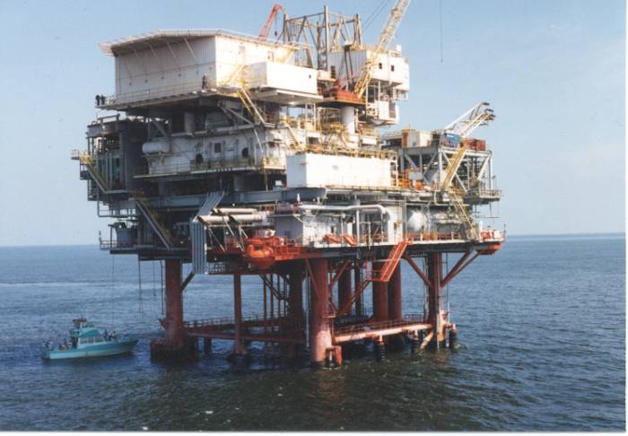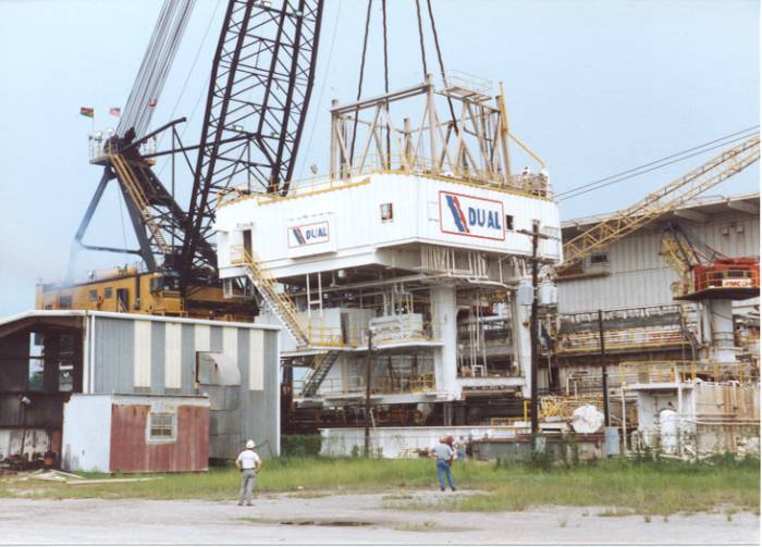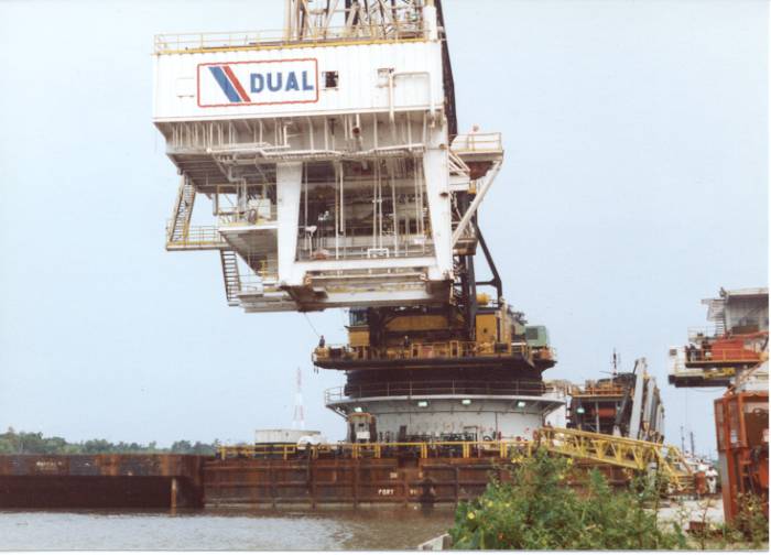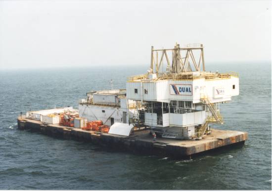 Prior to my work with Texaco on the Petronius Platform, I worked with Texaco on another unique project, the installation of an 84" diameter caisson on an existing platform along with a standard API drill rig installation. The project involved designing and fabricating custom jigs to be taken to the platform to measure as-built dimensions on the sub sea platform bracing. From these dimensions, we fabricated guides that would be installed below the water to contain the caission piles as we added sections and welded additional piles. A sub contract dive boat was used to perform much of the pre-installation work as well as the installation of the clamps, which fit perfectly. The DB Ocean Builder was used to install the caisson piles which featured several 4" weld splices. Once the piles had penetrated the mudline and were self supporting, 500,000 ft-lb steam hammers were used to pound them to design penetration. The Dual Rig #25 was loaded out in Morgan City, LA by the DBII and brought to the worksite where the Ocean Builder set the rig atop the unique mudslide platform. Much credit also needs to go out to a seperate work crew headed by our welder foreman (let's call him "the Pope") that stayed on after the derrick barge would depart to perform some awkward piping work that the customer had requested.