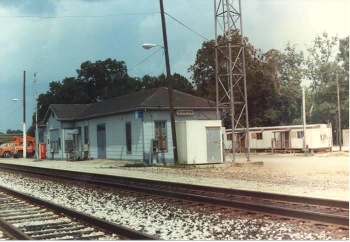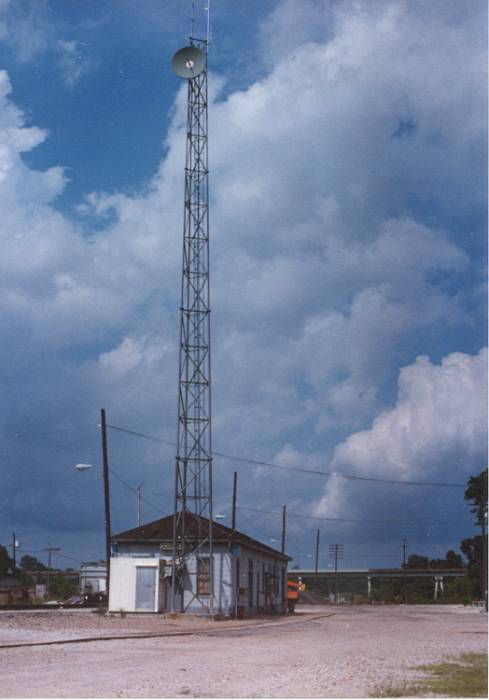 View of the depot showing side away from the tracks and the communications tower and hut just west of the depot |