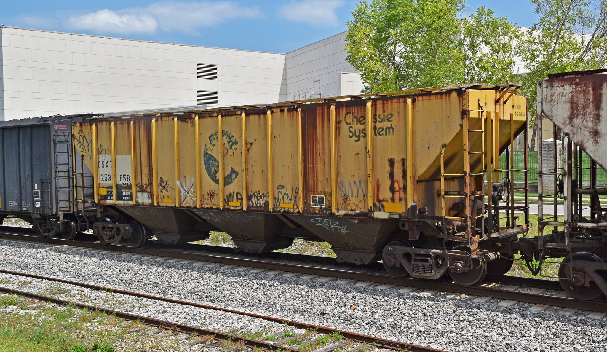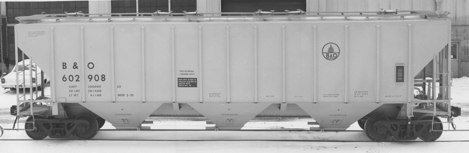 These 100 ton, 3-bay covered hopper cars were built by PS (Lot 9475) in 2/1970. They featured 4427 ft3 capacity. They were assigned to B&O class HC-30.