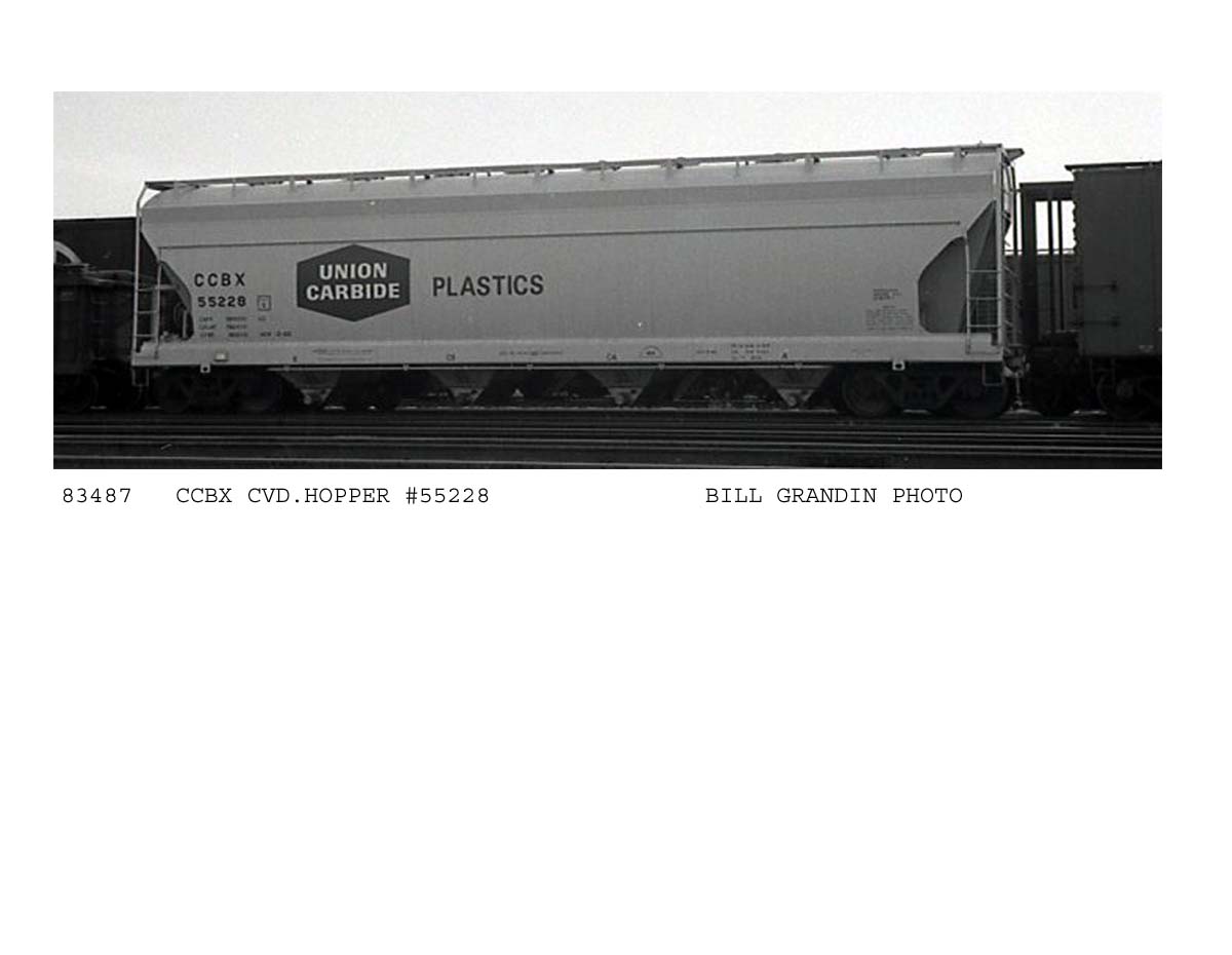 These 4-bay, 100-ton, covered hopper cars were built by AC&F as above as high capacity Center Flow CF5250 cars. They featured 5250 ft3 capacity.