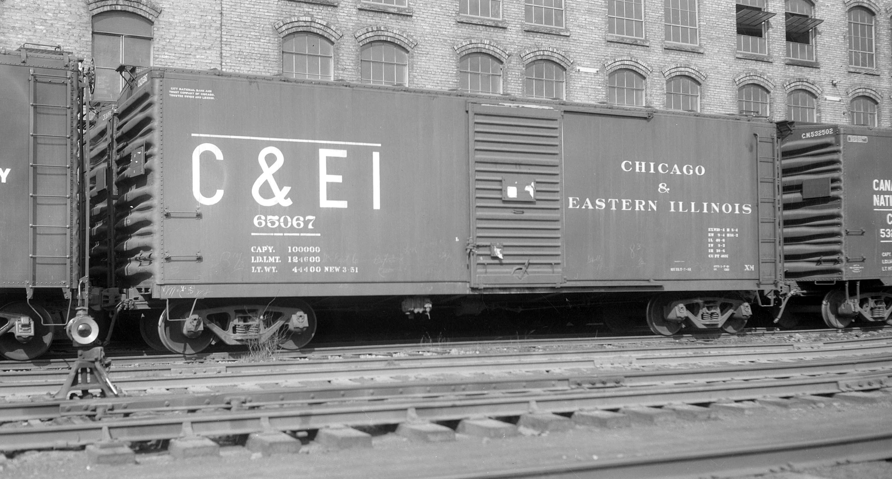 These 40'-6", 50 ton box cars were built by C&EI-Danville (EIEC) in 2/1951. They featured 6' Youngstown sliding doors with Camel fixtures or Utility doors and fixtures, Std. Rwy. Equ. Mfgr. Co. diagonal panel riveted roof, dreadnaught steel ends, US Gypsum metal running board and brake step, Champion-Peacock vertical wheel hand brake, ASF A-3 Ride Control trucks and 3897 ft3 capacity.