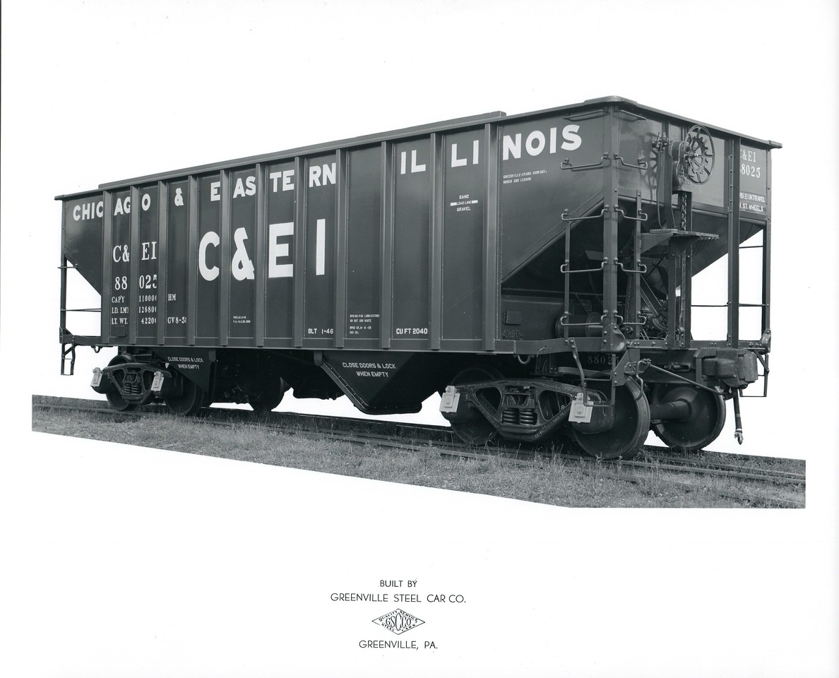 These 2-bay, 55 ton open hopper cars were rebuilt by C&EI/Greenville Steel Car Co. as above in 1958 from existing PS-built C&EI 97500-97999. They featured 2040 ft3 capacity.