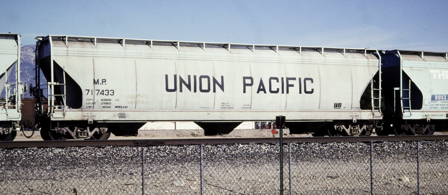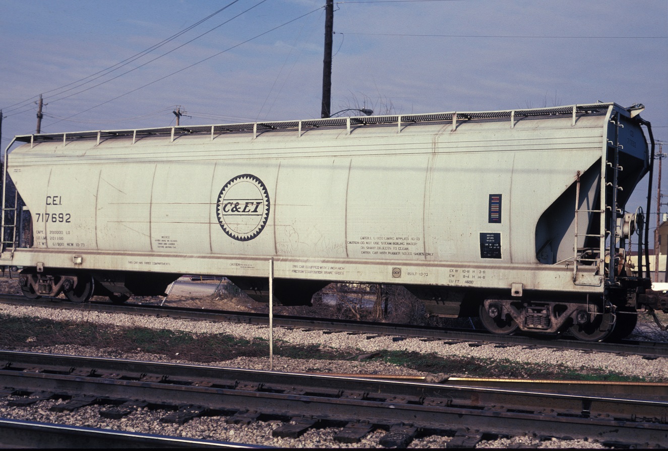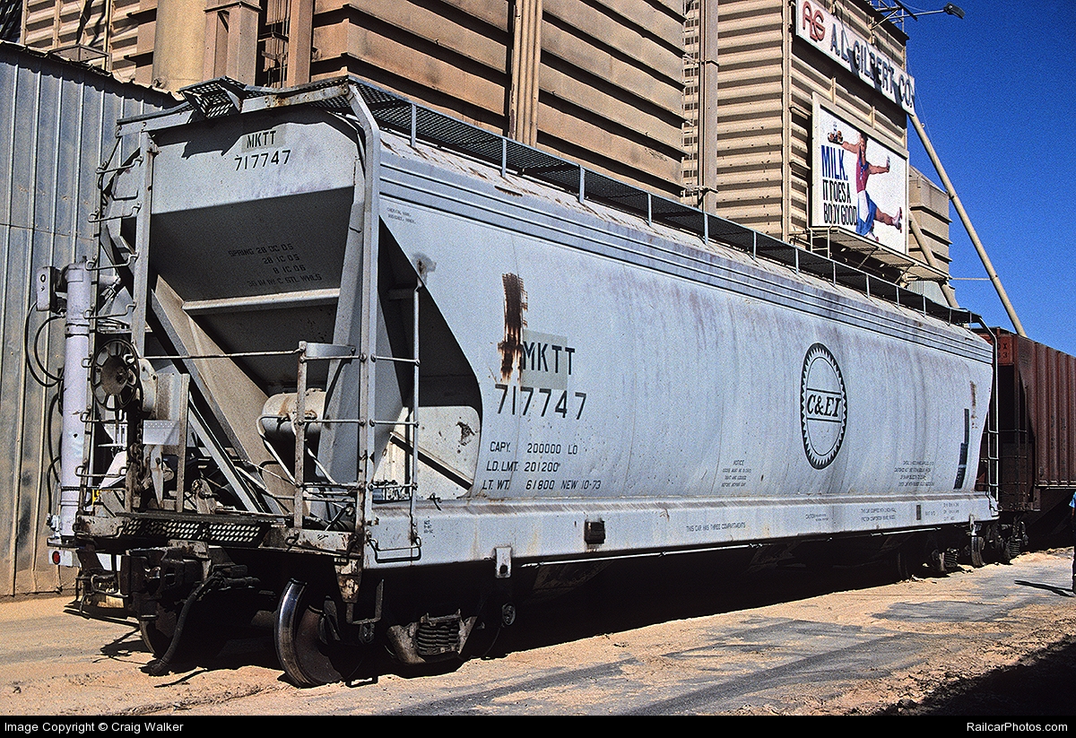These 3-bay, 100-ton, covered hopper cars were built by AC&F (Lot 11-01280) in 10-11/1973. They featured 4600 ft3 capacity. The MP eventually renumbered many of the remaining C&EI cars with MP reporting marks. At least one (MP 717433) received an early version of post-merger UP lettering. At lease one car was relettered for MKTT (an MKT subsidiary in the state of Texas) with the same road number. More info on is needed on this such as when the change took place and why. It is presumed that it was done by UP which owned both roads at the time.