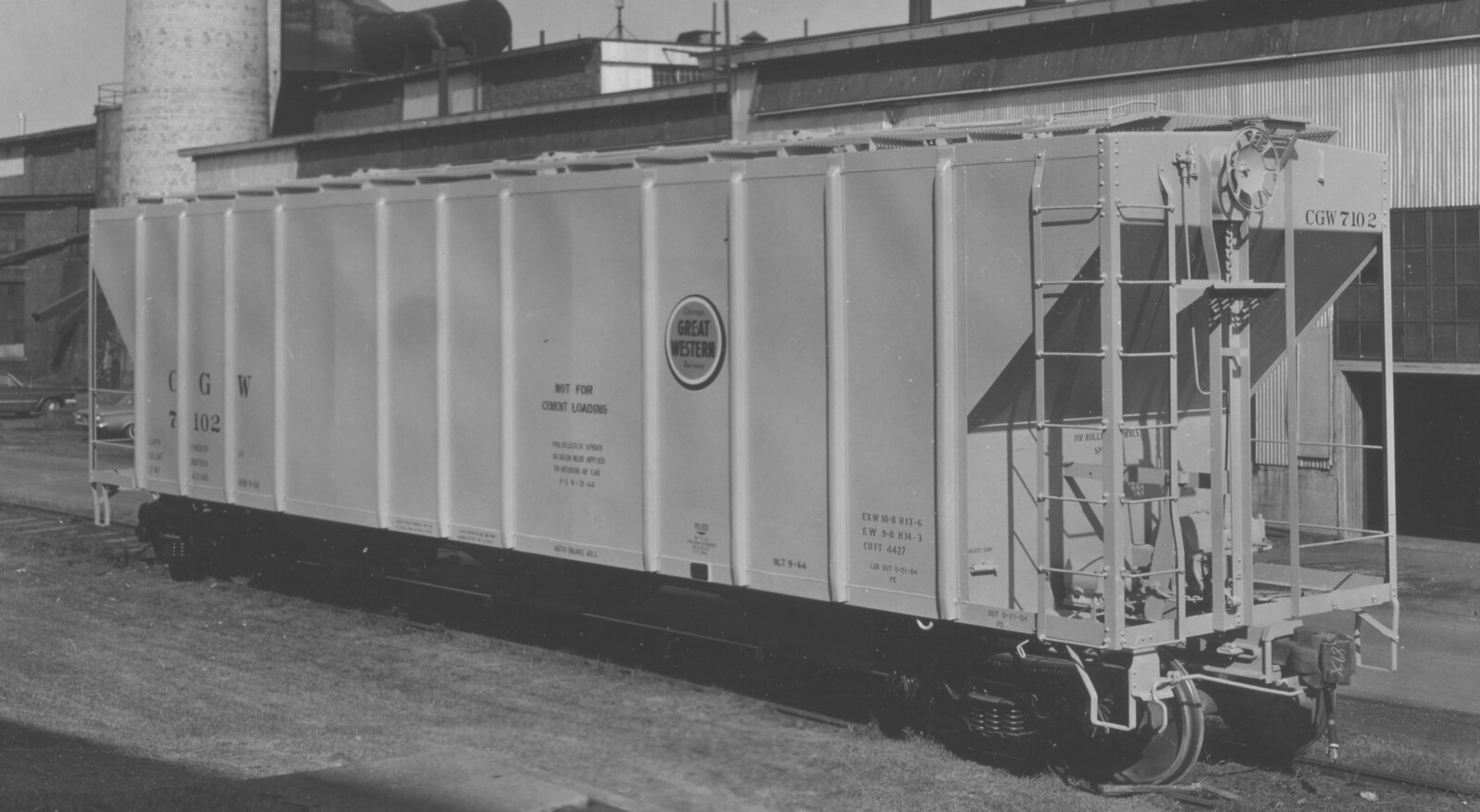 These 3-bay, 100 ton covered hopper cars were built by PS (Lot 8945) in 9/1964. They featured 4427 ft3 capacity.