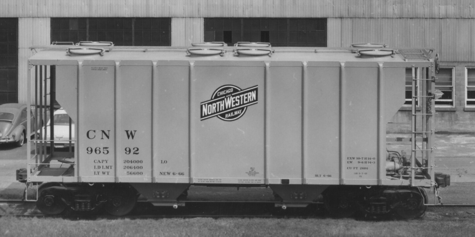 These 2-bay, 100-ton, covered hoppers were built by PS (Lot 9132) in 6-7/1966. They featured 2604 ft3 capacity.