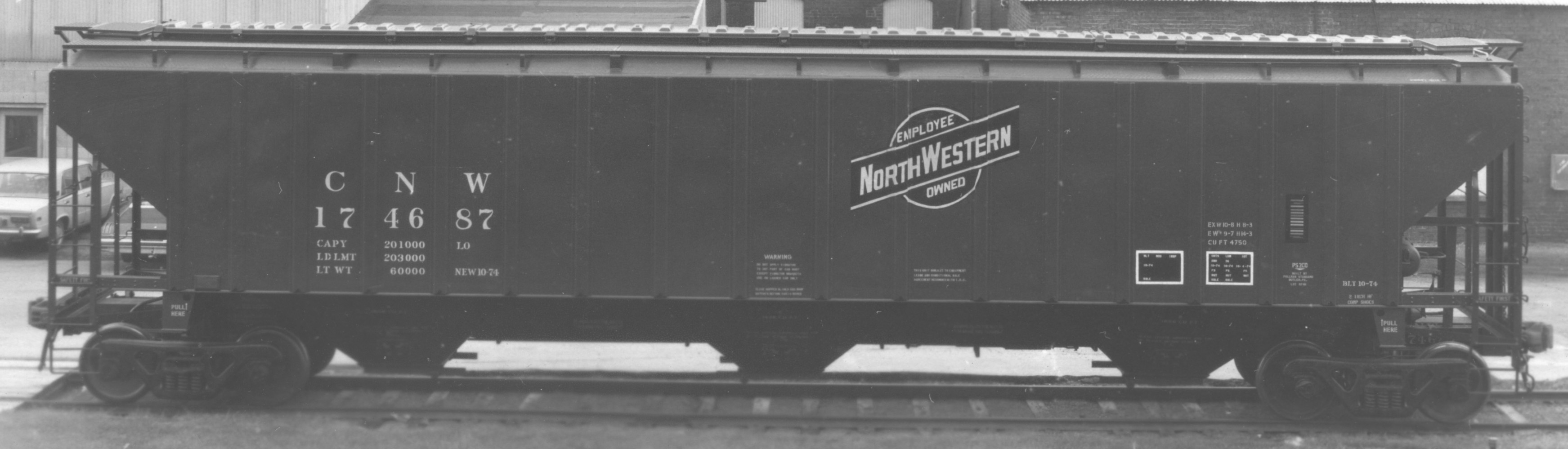 These 3-bay, 100-ton, covered hopper were built by PS (Lot 9748) in 8-10/1974. They featured 4750 ft3 capacity.