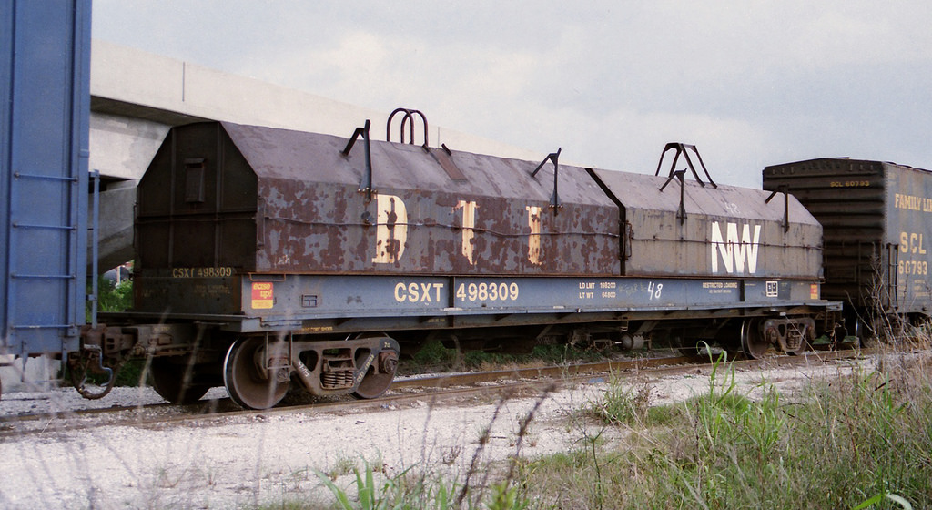 These 100 ton, coil steel gondolas were built by C&O Raceland Shops from Evans kits in 1974. They featured two covers and were used in coil steel service.