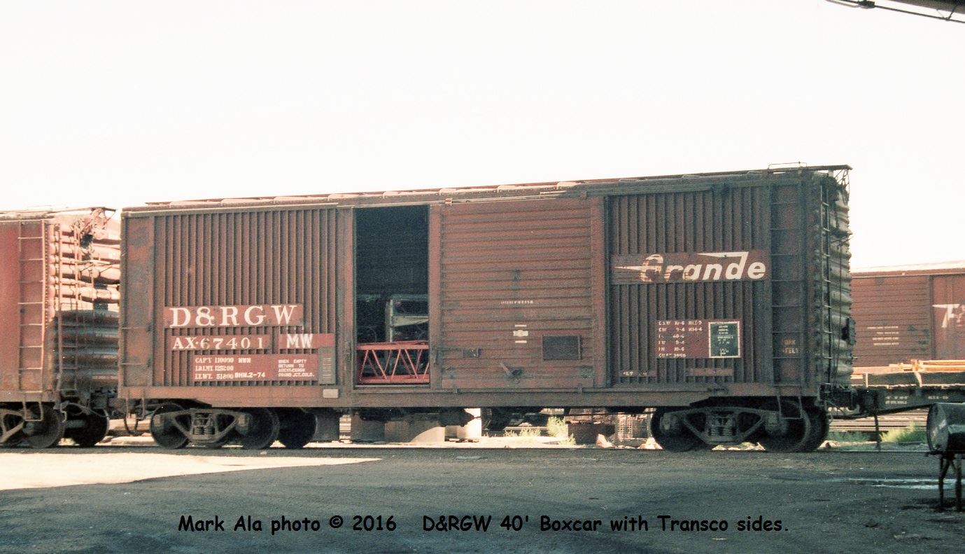 Twenty cars were rebuilt and renumbered with distinctive Transco sides by Transco as D&RGW 67400-67419.