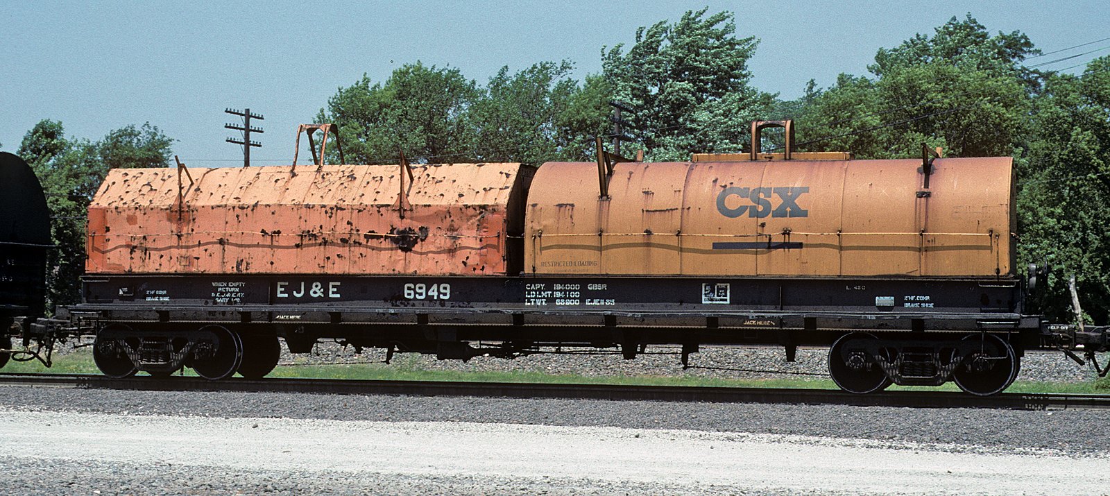 These 48'-0", 100 ton coil steel gondolas were built by EJ&E Shops, from Evans kits in 1977. They featured two hoods and 1325 ft3 capacity.