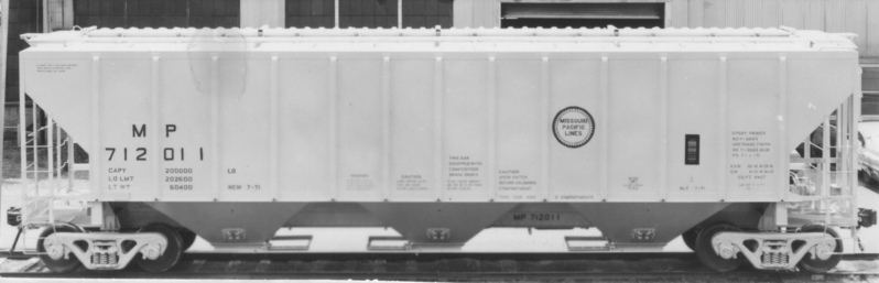 These 3-bay, 100 ton, covered hopper cars were built by PS (lot 9548) in 6/1971. They featured 4427 ft3 capacity.