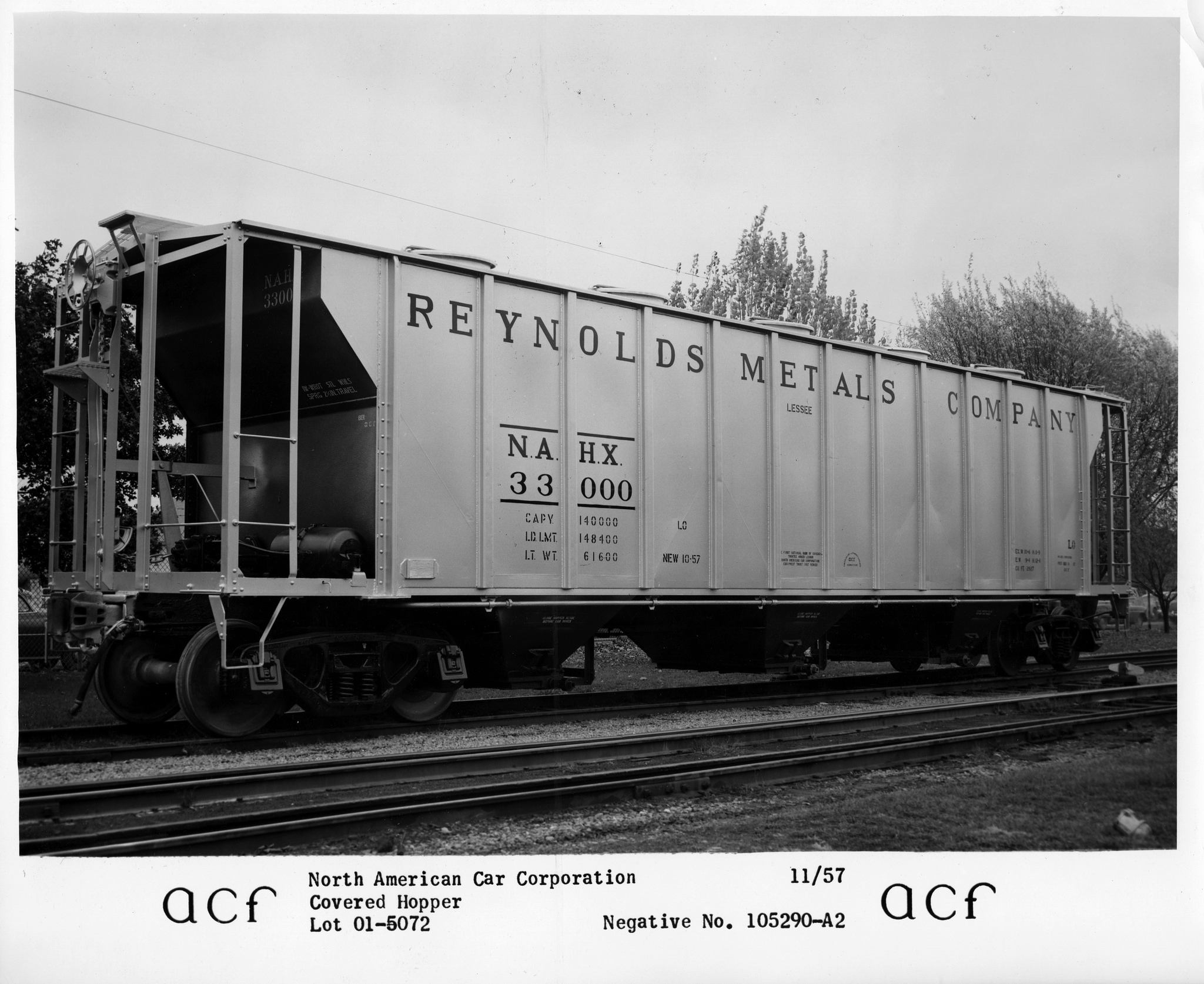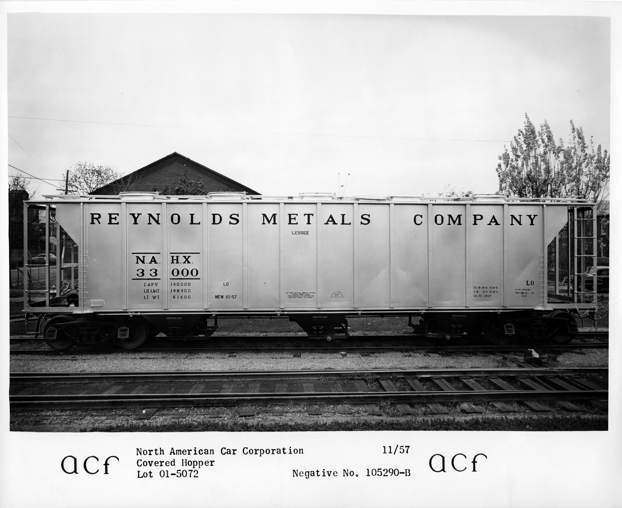 These 3-bay, 70 ton covered hopper cars were built by AC&F (lot 01-5072) in 10-11/1957. They featured 2927 ft3 capacity. It appears that many if not all of the cars in this group were initially leased to Reynolds Metals. Some ended up as CPAA cars with their Reynolds lettering still intact.