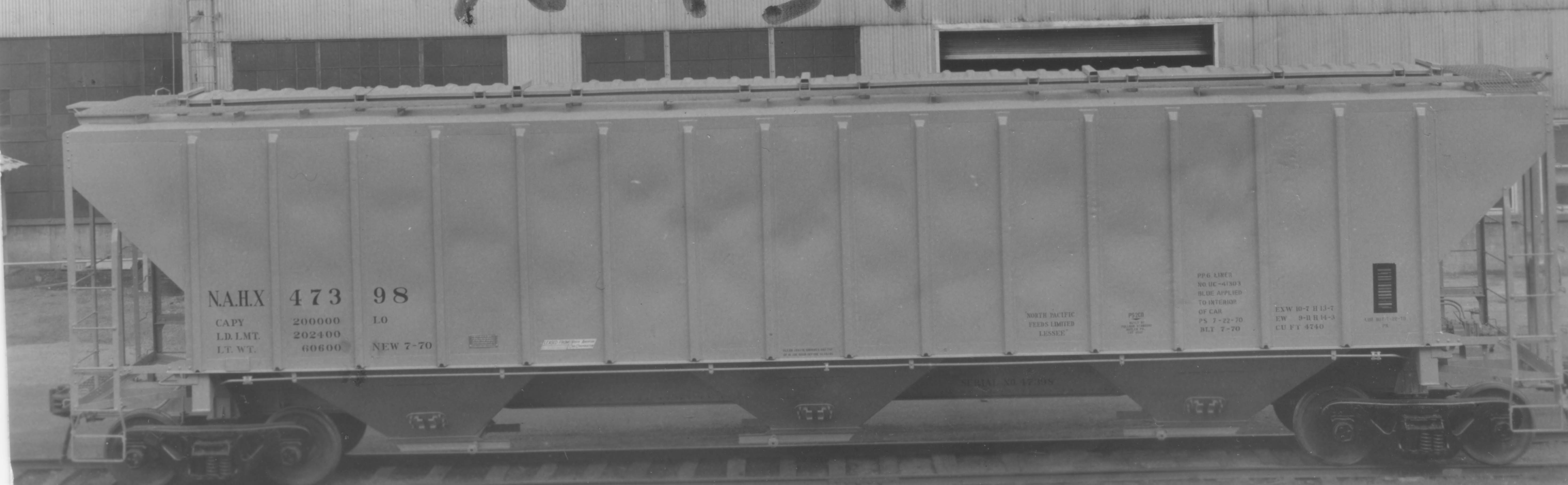 These 3-bay, 100 ton, covered hopper cars were built by PS (Lot 9507) in 7/1970. They featured 4740 ft3 capacity.