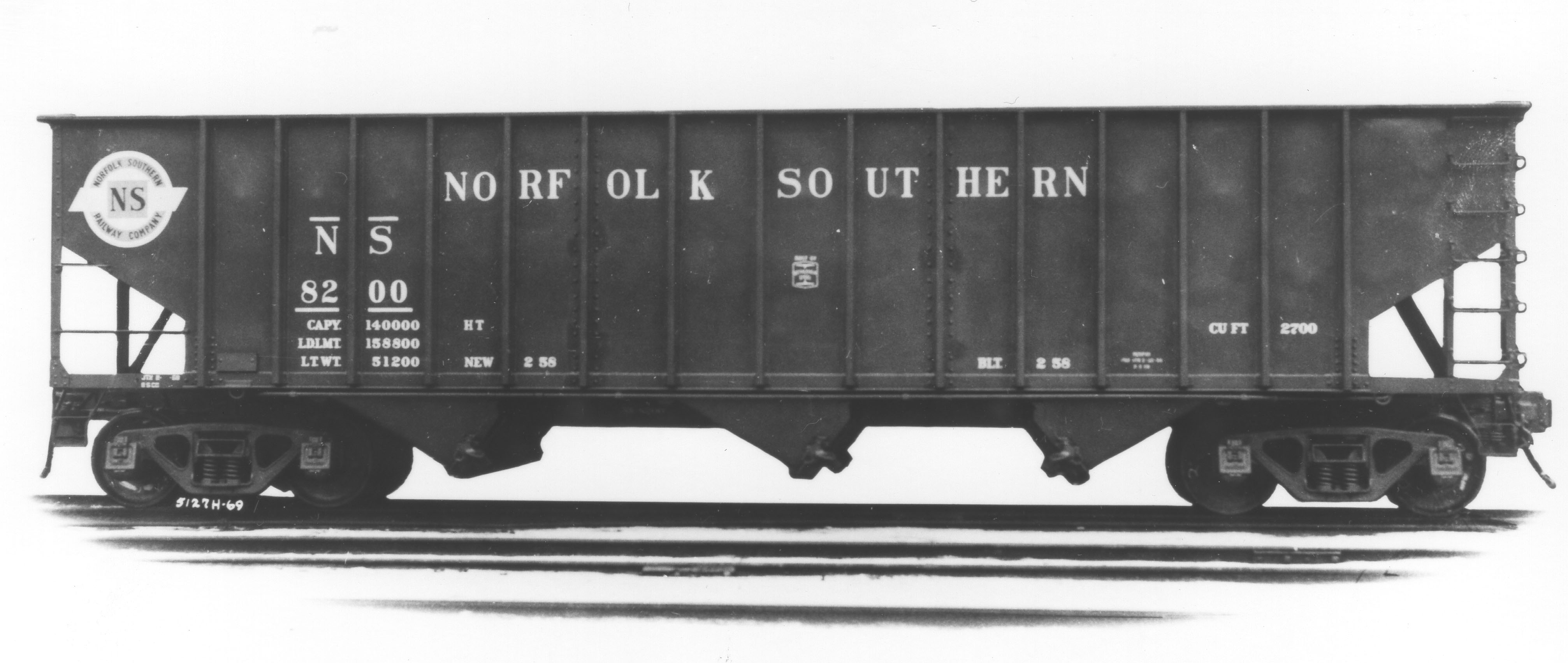 These 3-bay, 70 ton open hopper cars were built by Bethlehem Steel Corp. in 2/1958. They featured 14-panel sides and 2700 ft3 capacity. They were later rebuilt with extended sides for woodchip service.