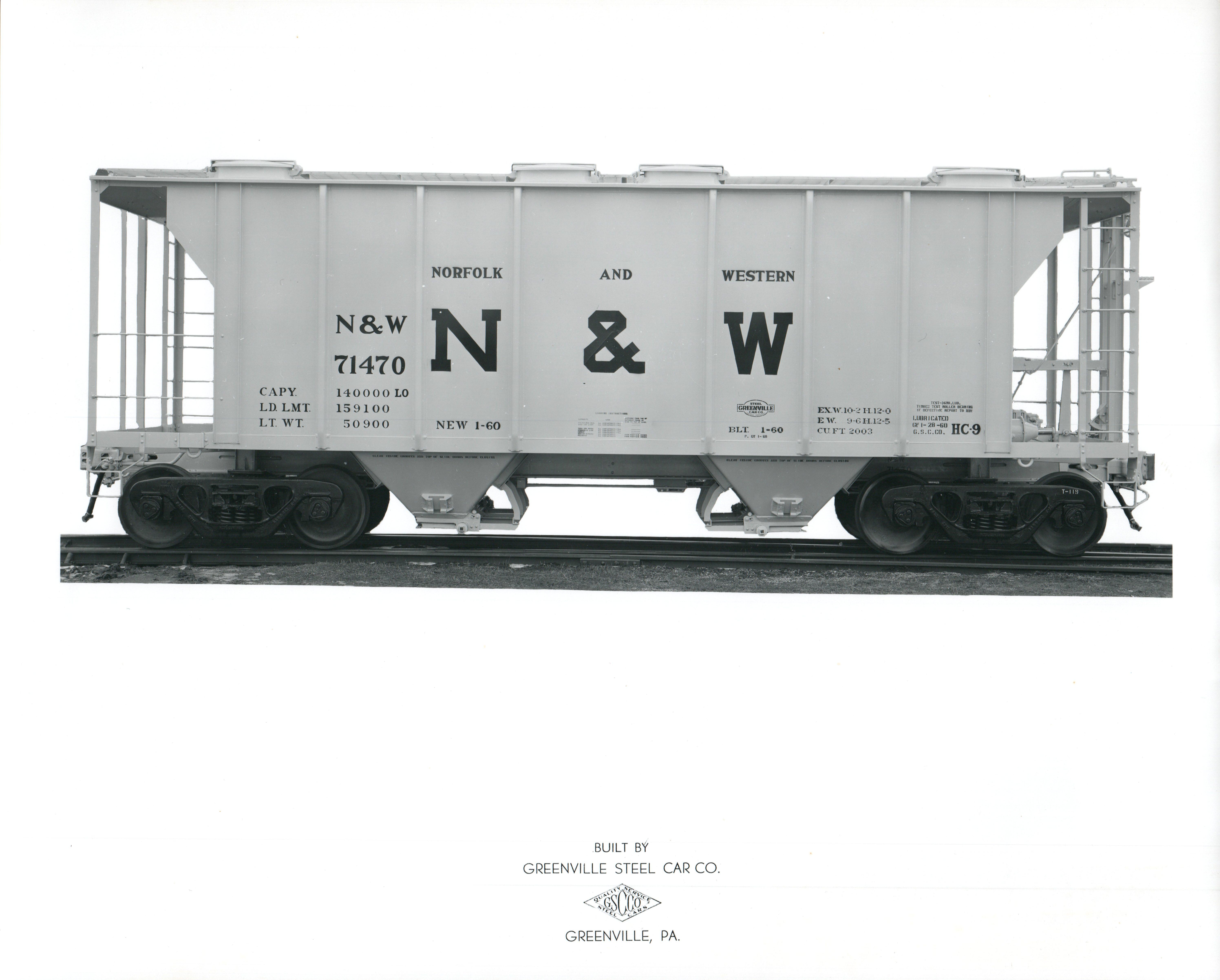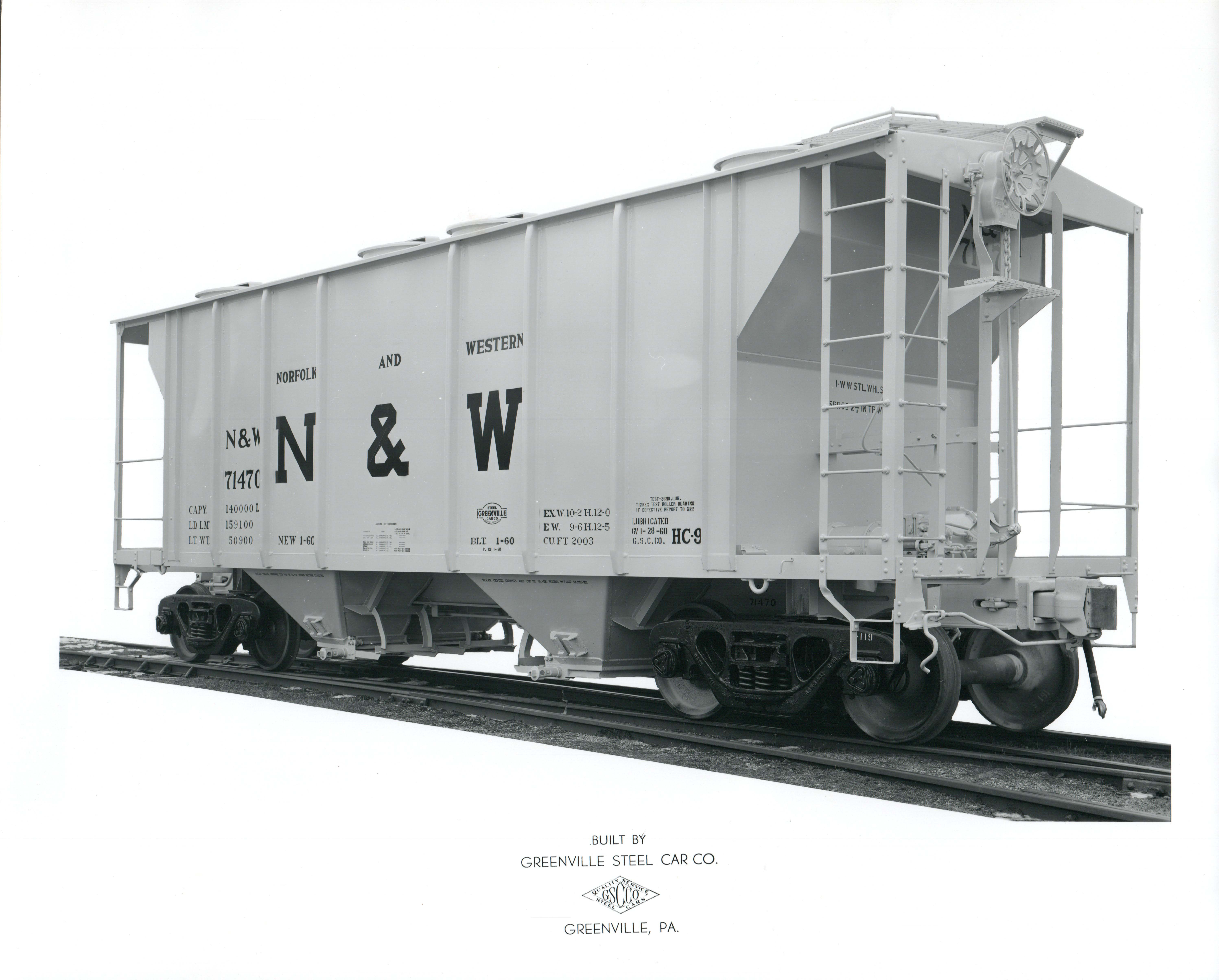 These 2-bay, 70 ton, covered hopper cars were built by Greenville Steel Car Co. (Order 739B) in 1/1960. They featured 2003 ft3 capacity. They were assigned to class HC-9.
