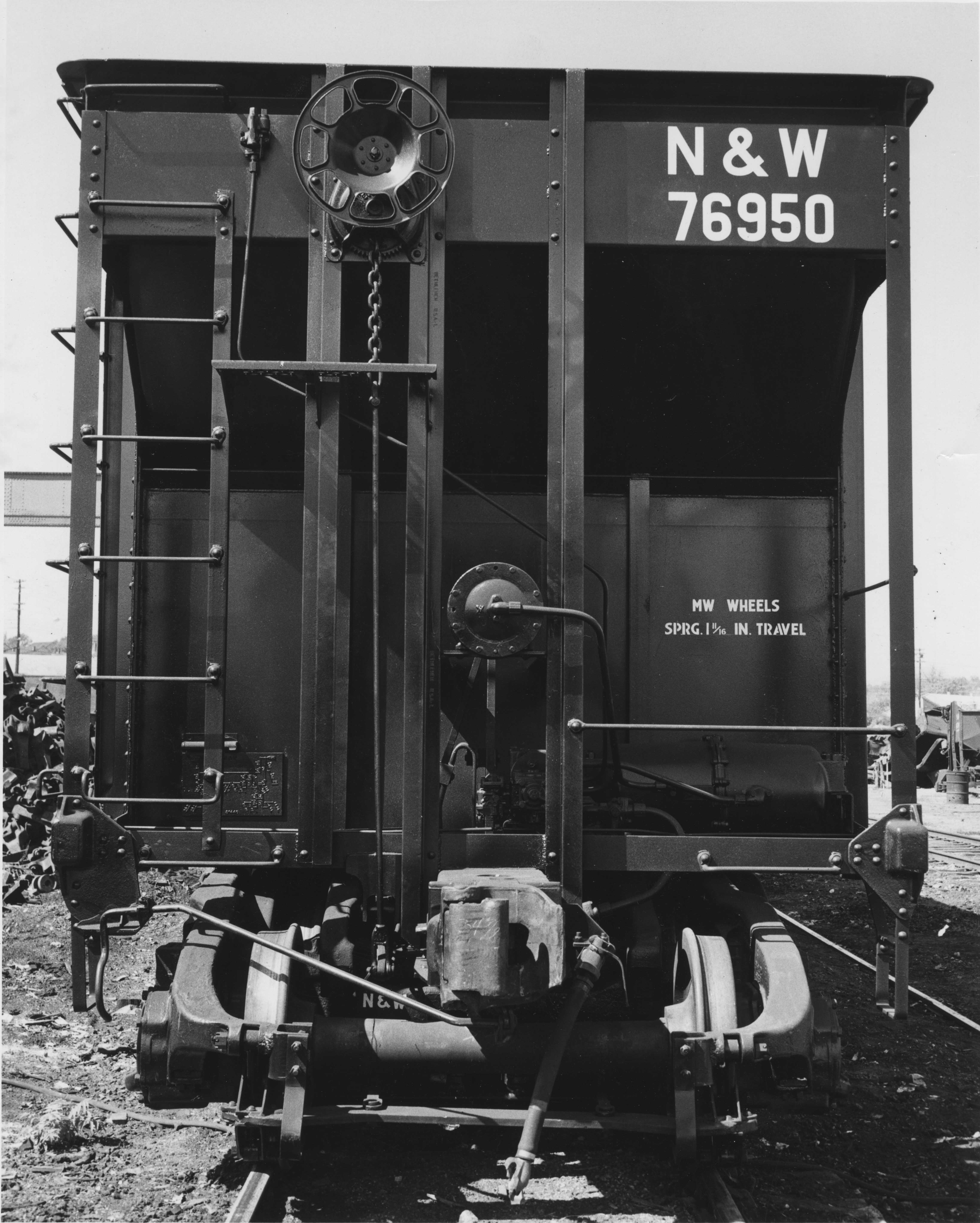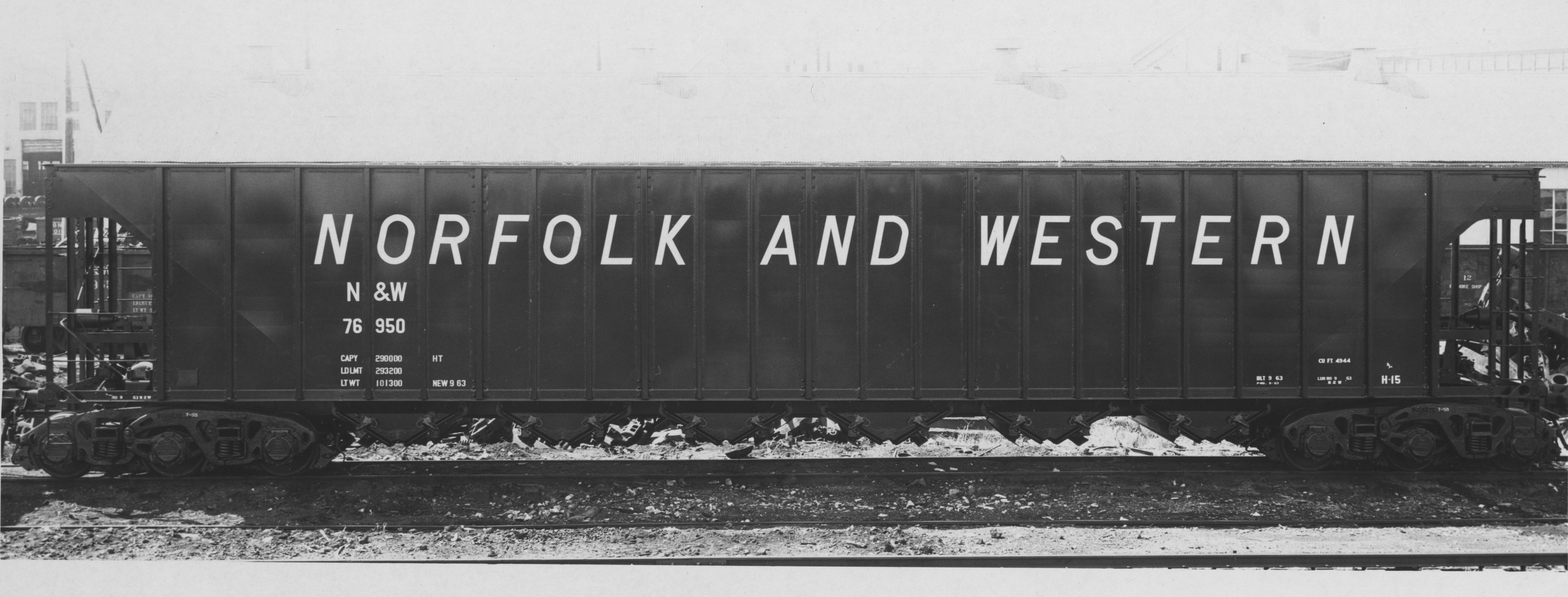 This 12-bay, 145 ton, open hopper car was built by N&W Roanoke Shops in 9/1963. It featured six-whelled trucks and 4944 ft3 capacity. It was assigned to class H-15.