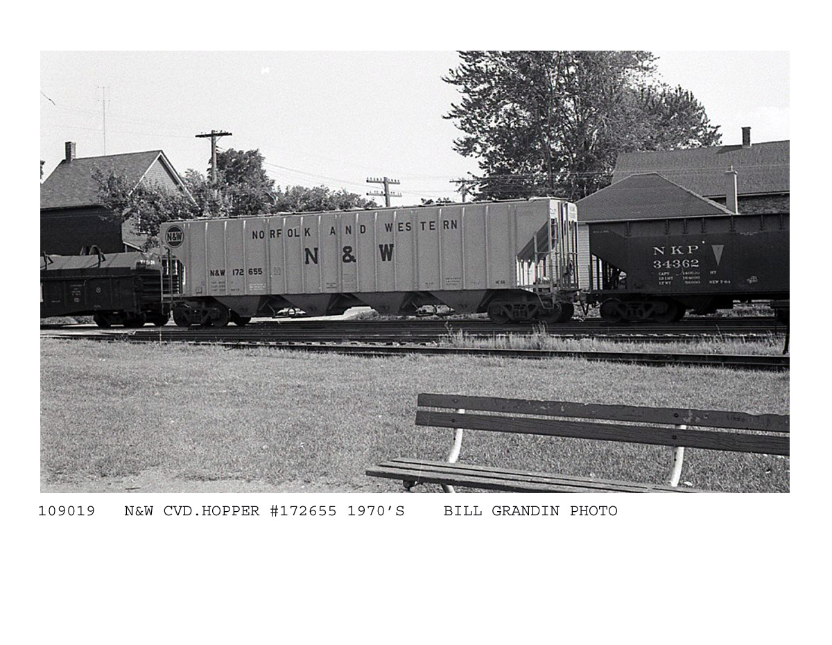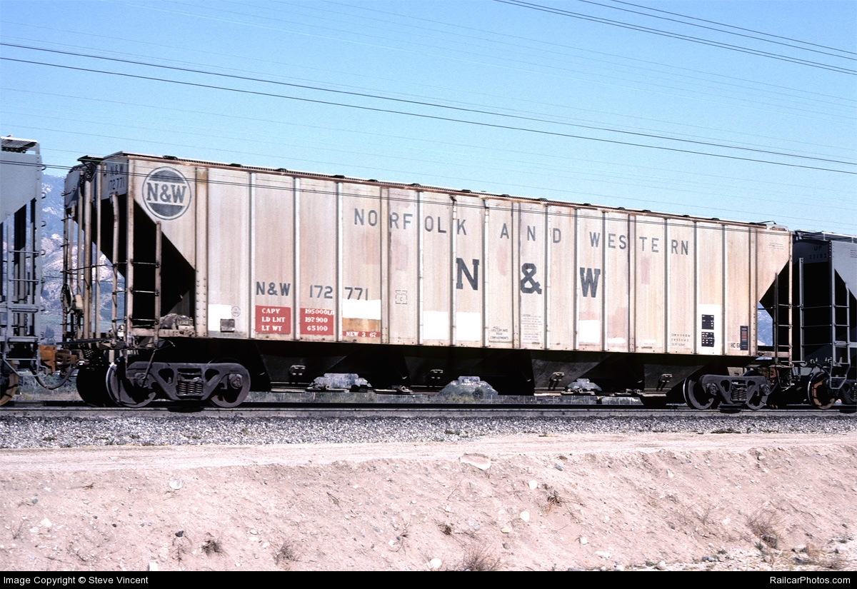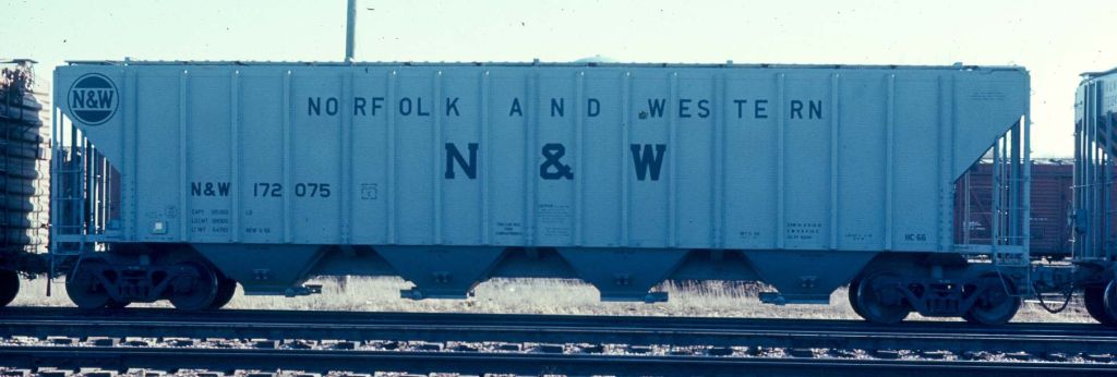 These 4-bay, 100-ton covered hoppers were built by N&W Roanoke Shops in 8/1966-3/1967. They featured 5200 ft3 capacity. They were assigned to class HC-66.