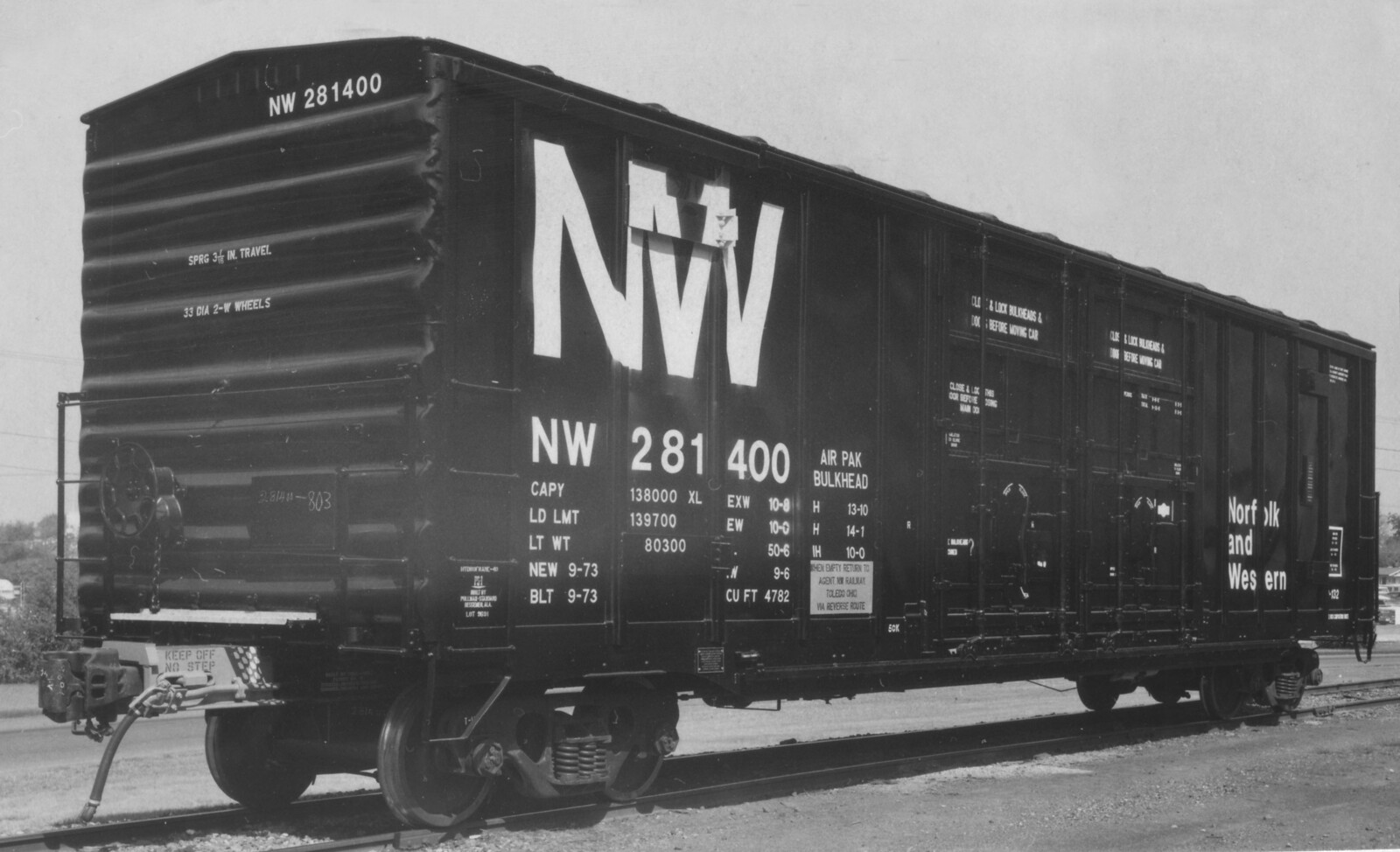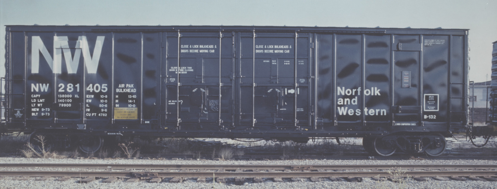 These 50'-6", 70-ton box cars were built by PS (Lot 9691) in 9/1973. They featured double 8' plug doors, H-40 cushioning, Air Pak loaders loaders and 4782 ft3 capacity. They were assigned to class B-132