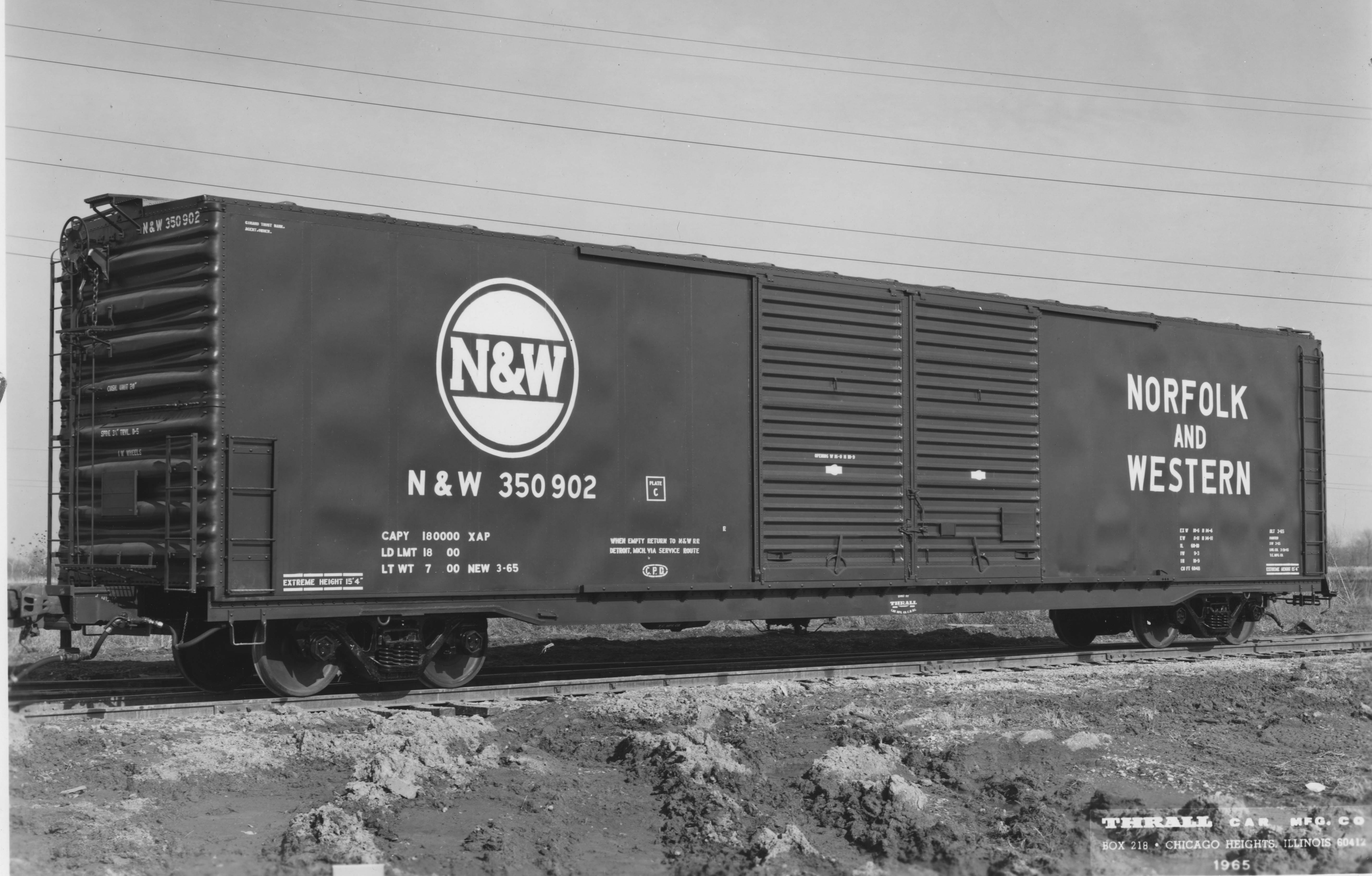 These 60'-10", 90 ton box cars were built by Thrall in 3/1965. They featured 8'+8' sliding doors (despite being noted as having plug doors in the ORER), 20" travel cushioned underframes and 5400 ft3 capacity, however 6048 ft3 is stenciled on the car side in the below photo. They were assigned to class B91b, but the builder's photo shows that it was not stenciled on the car at least when the photo was taken.