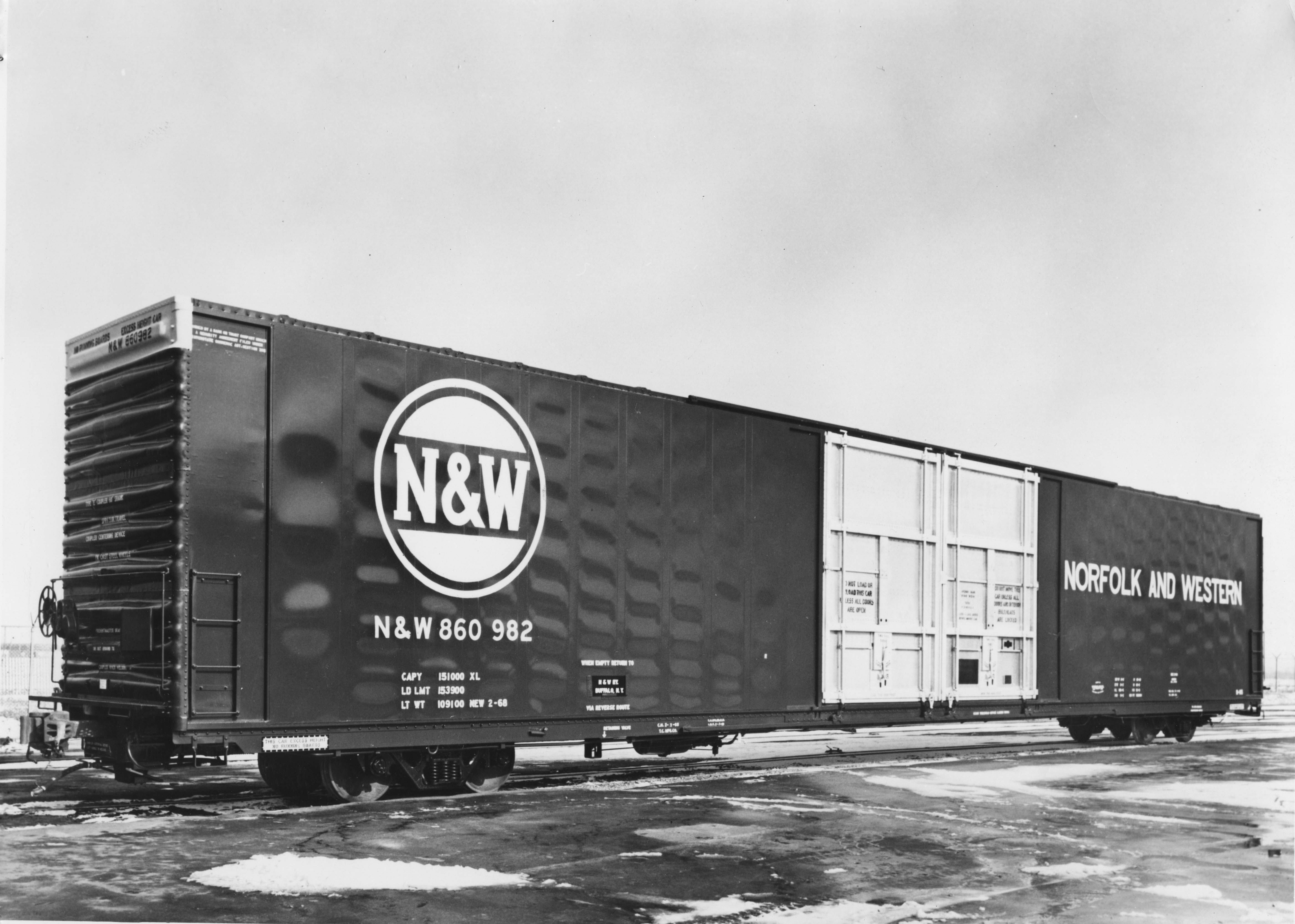 These 86'-6", 75 ton hi-cube box cars were built by Thrall (Job 419) in 2/1968. They featured 10,000 ft3 capacity. They were assigned to class B-115.