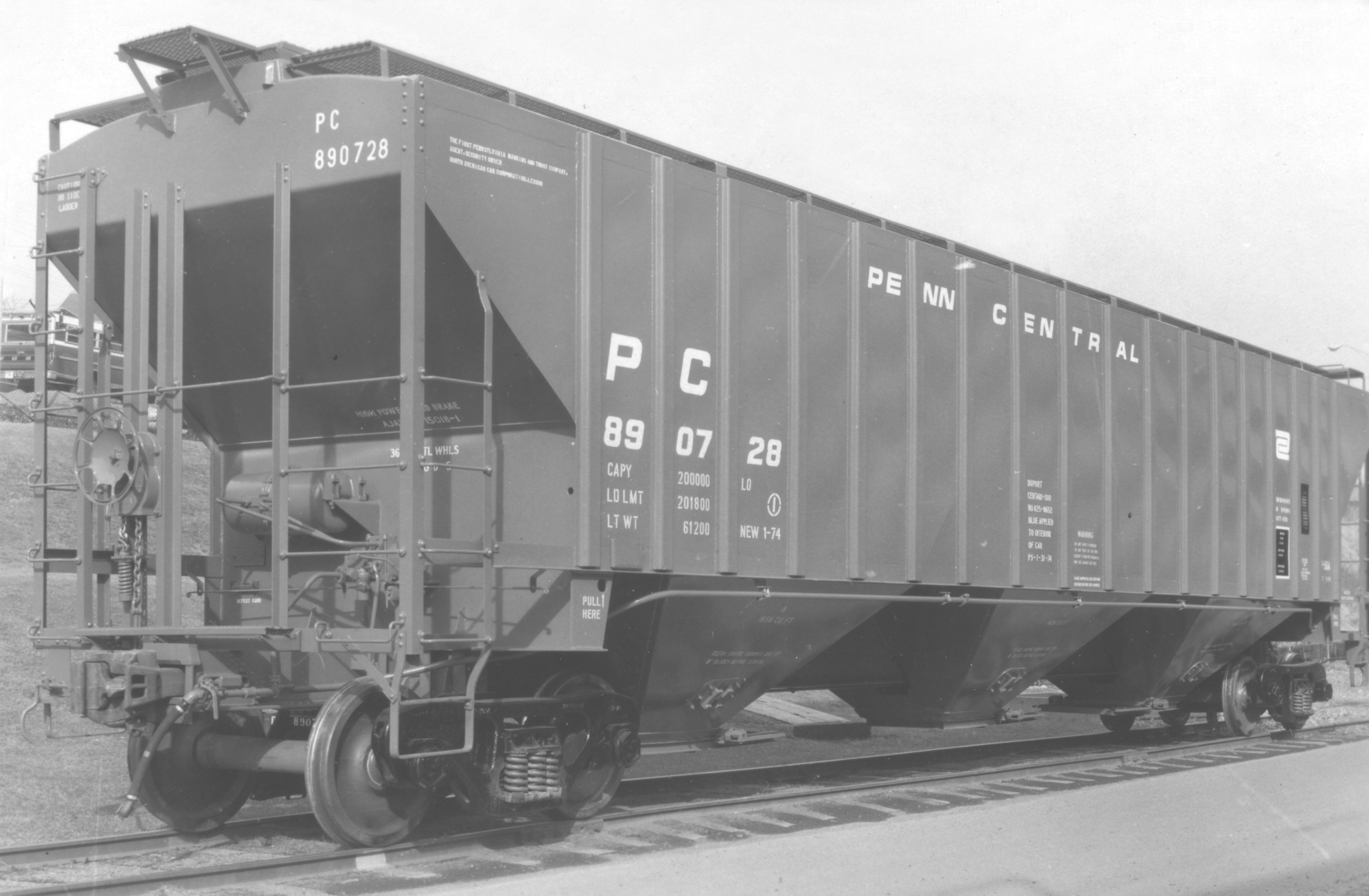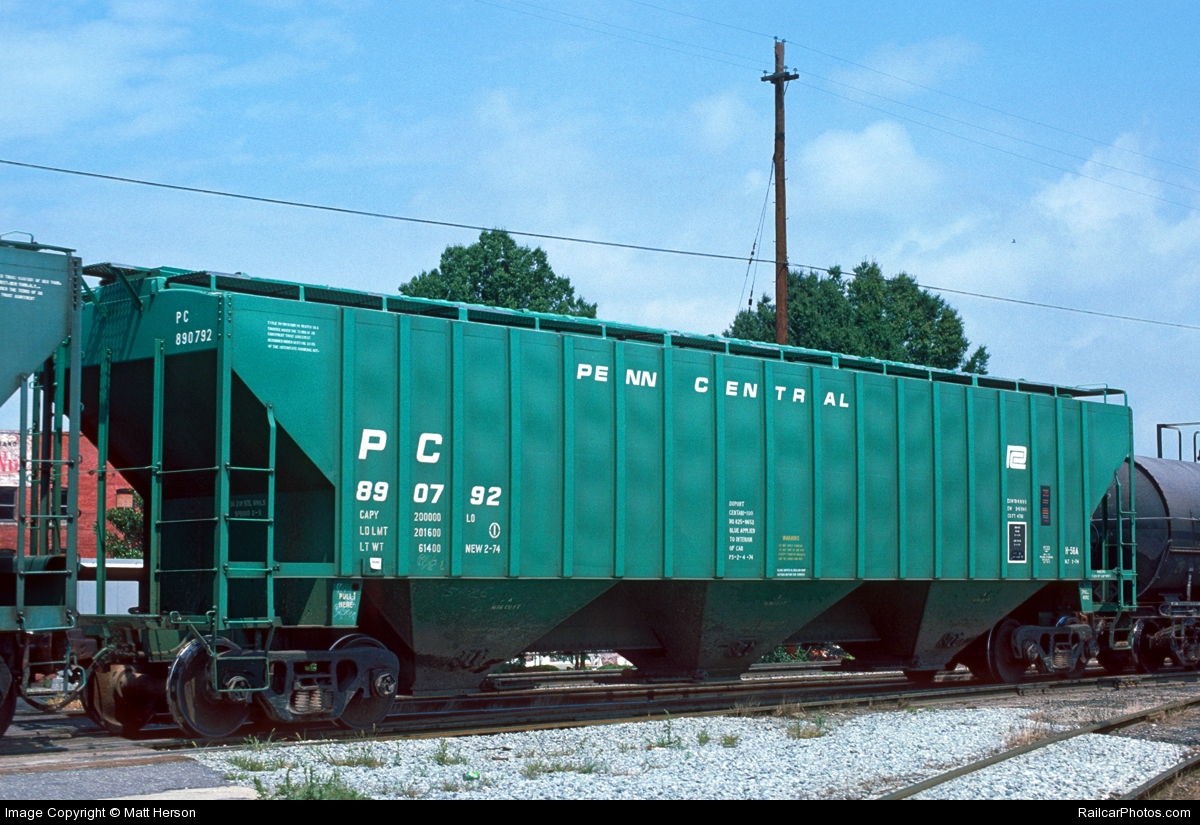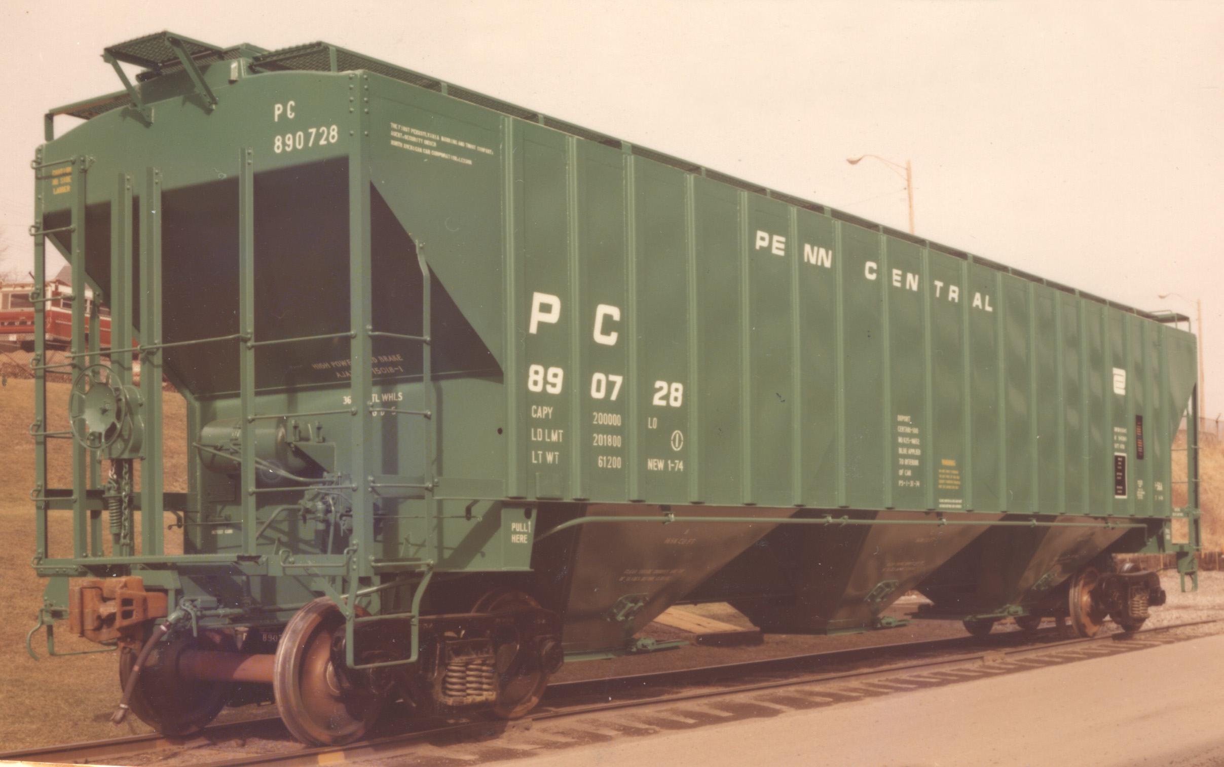 These 100 ton, 3-bay covered hopper cars were built by PS (Lot 9713) in 1/1974. They featured 4750 ft3 capacity. They were assigned to class H56A.