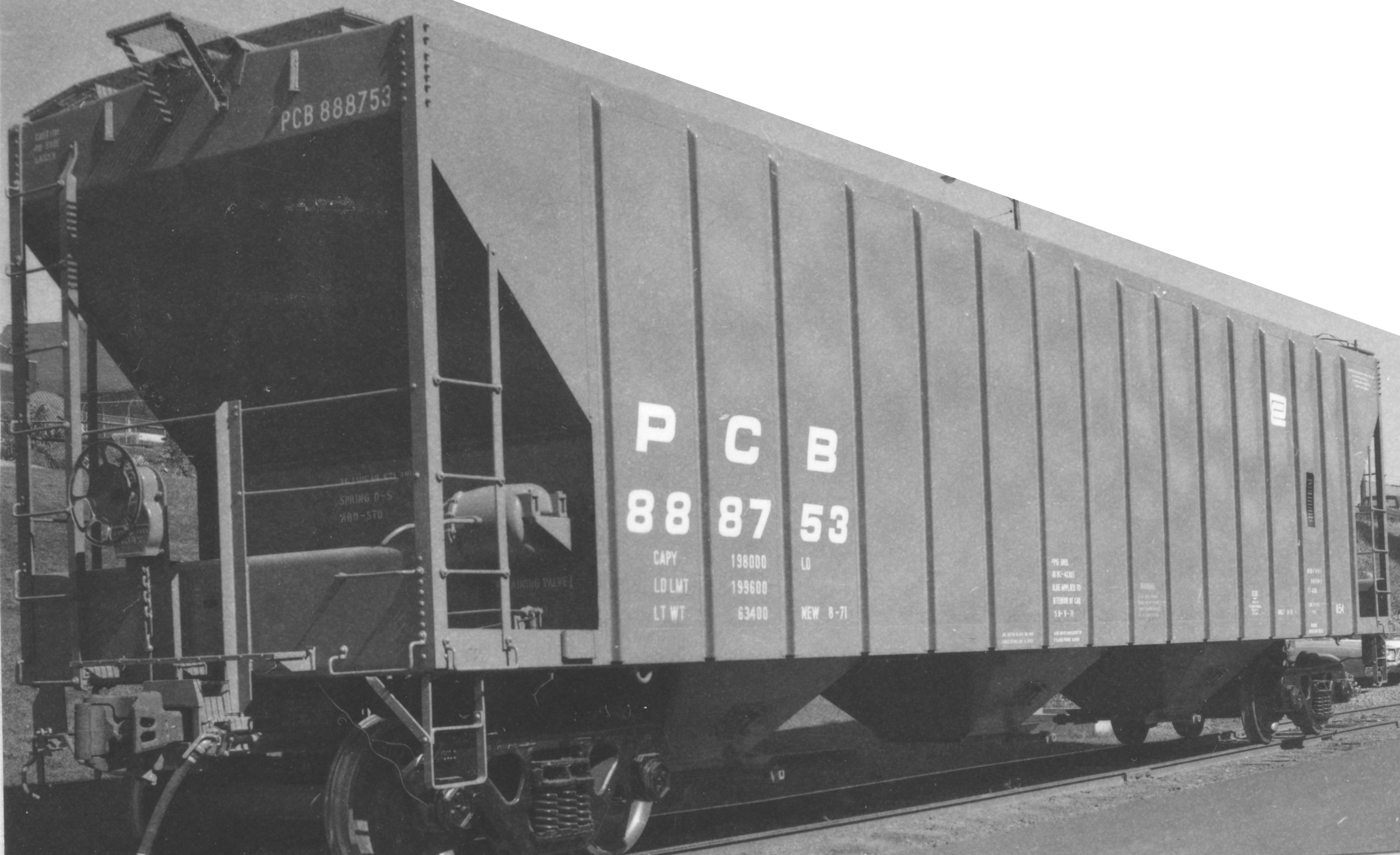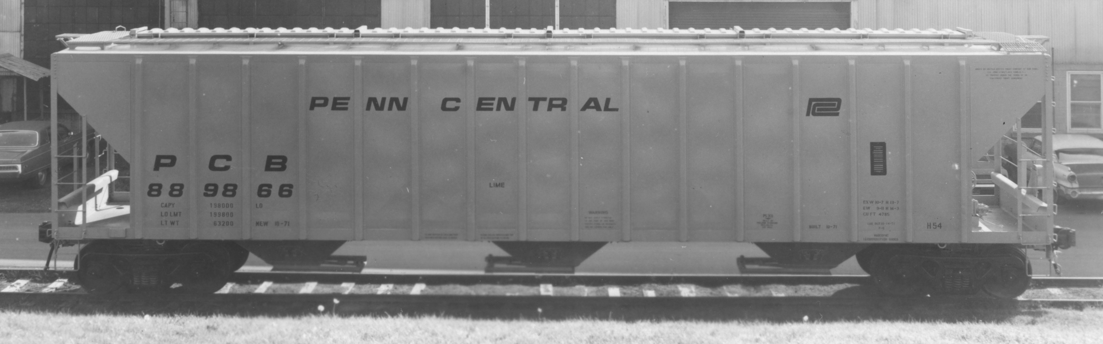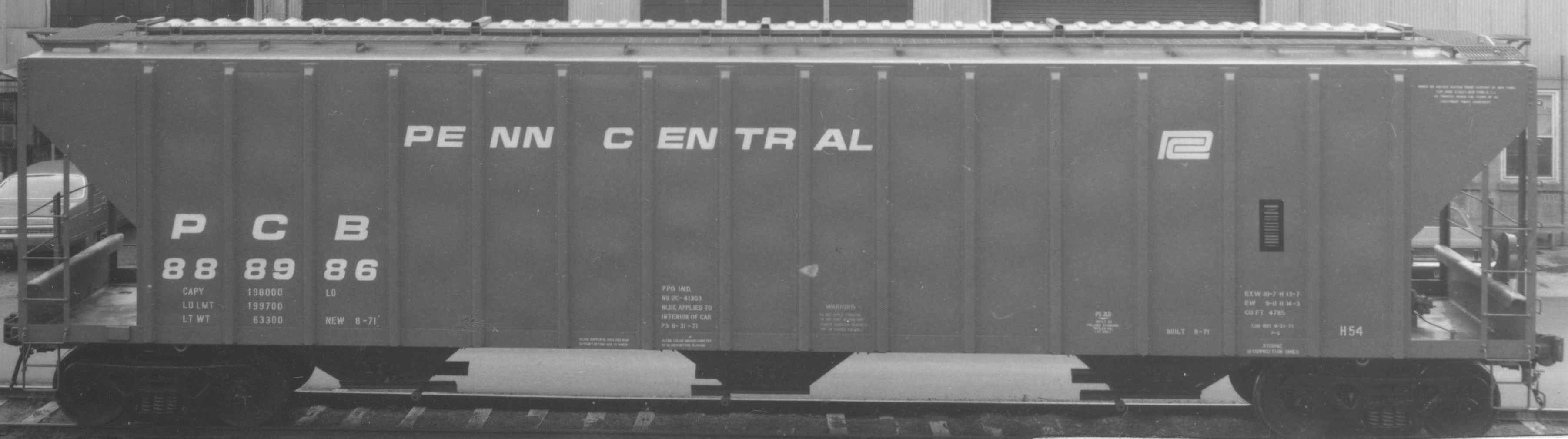 These 3-bay, 100-ton covered hoppers were built by PS as above. They featured 4785 ft3 capacity. They were assigned to class H54.