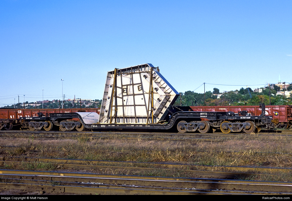 These 185-ton, depressed center flat cars were built by Maxson in 3/1982. They featured a pair of 4-wheel trucks under each end connected via a span bolster.
