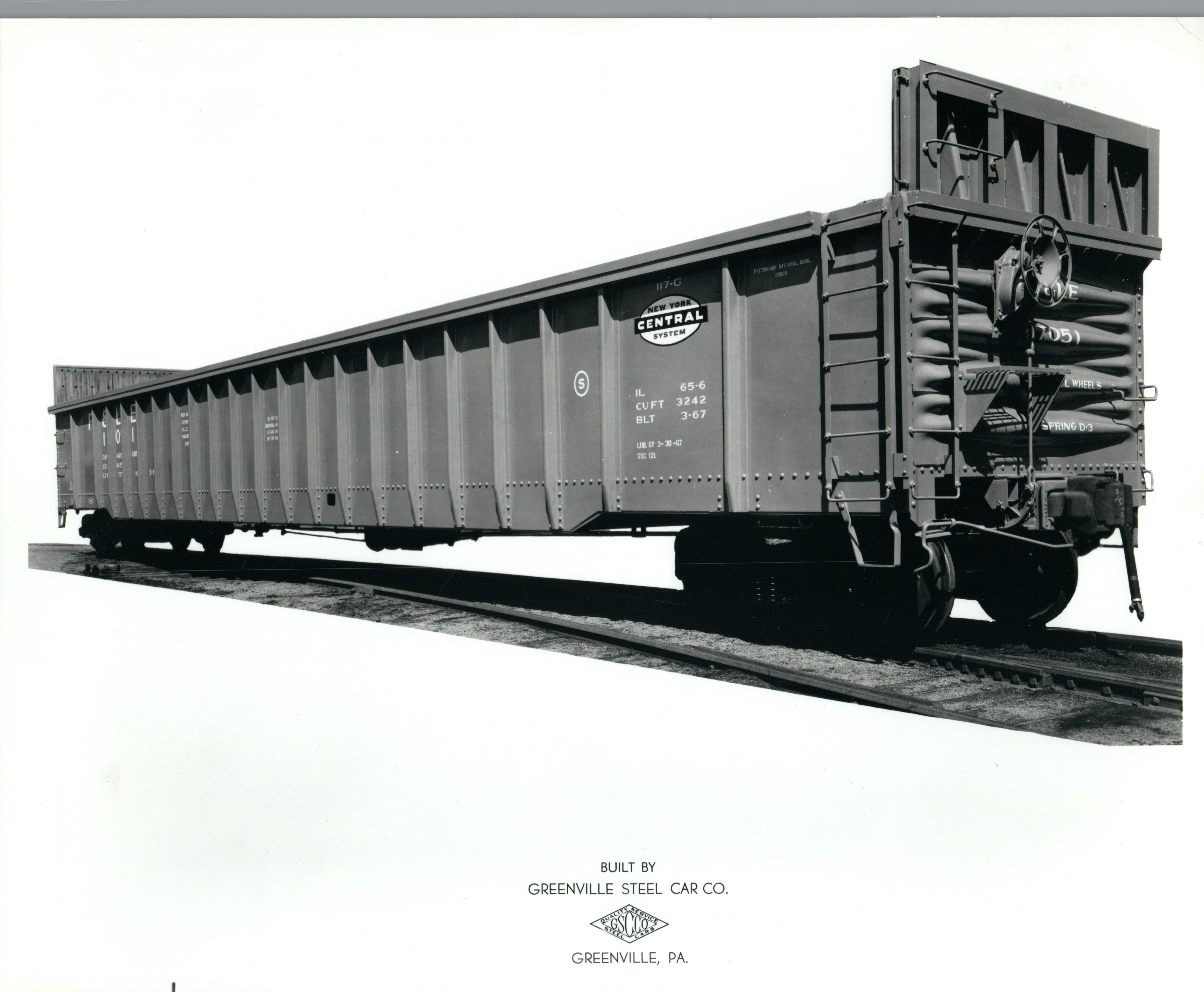 These 65'-6", 70-ton, gondolas were built by Greenville Steel Car Co. (Order 919) in 3-5/1967. They featured 21-post sides, fixed ends, steel floors, end bulkheads and 3242 ft3 capacity. They were assigned to class 117-G.