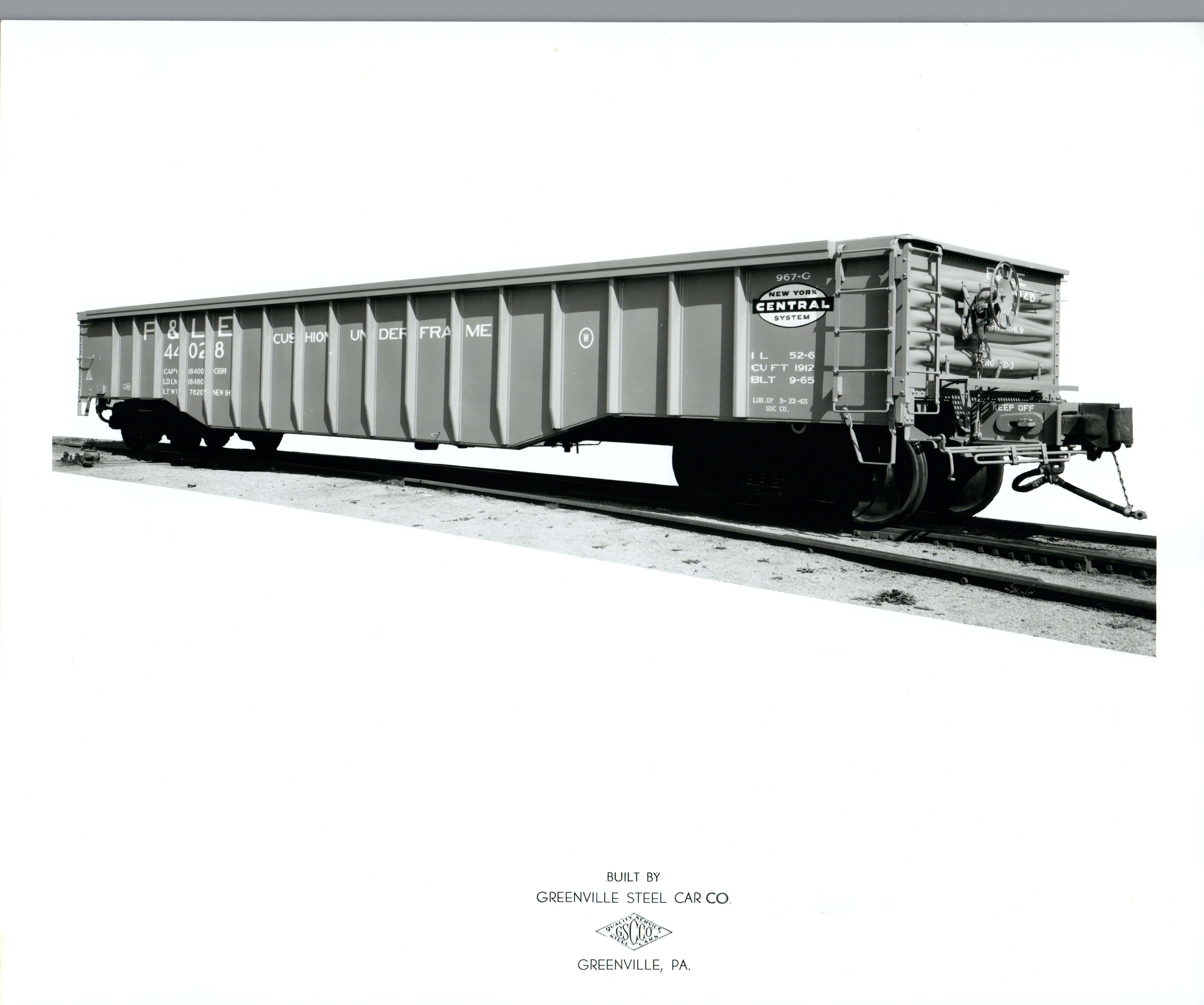 These 52'-6" gondolas were built by Greenville Steel Car Co. (Order 868) in 9-11/1965. They featured 17-post sides, fixed ends, steel floors, cushioned underframes and capacity as above. Some appear to have been later fitted with covers for coil steel service. They were assigned to class 967-G.