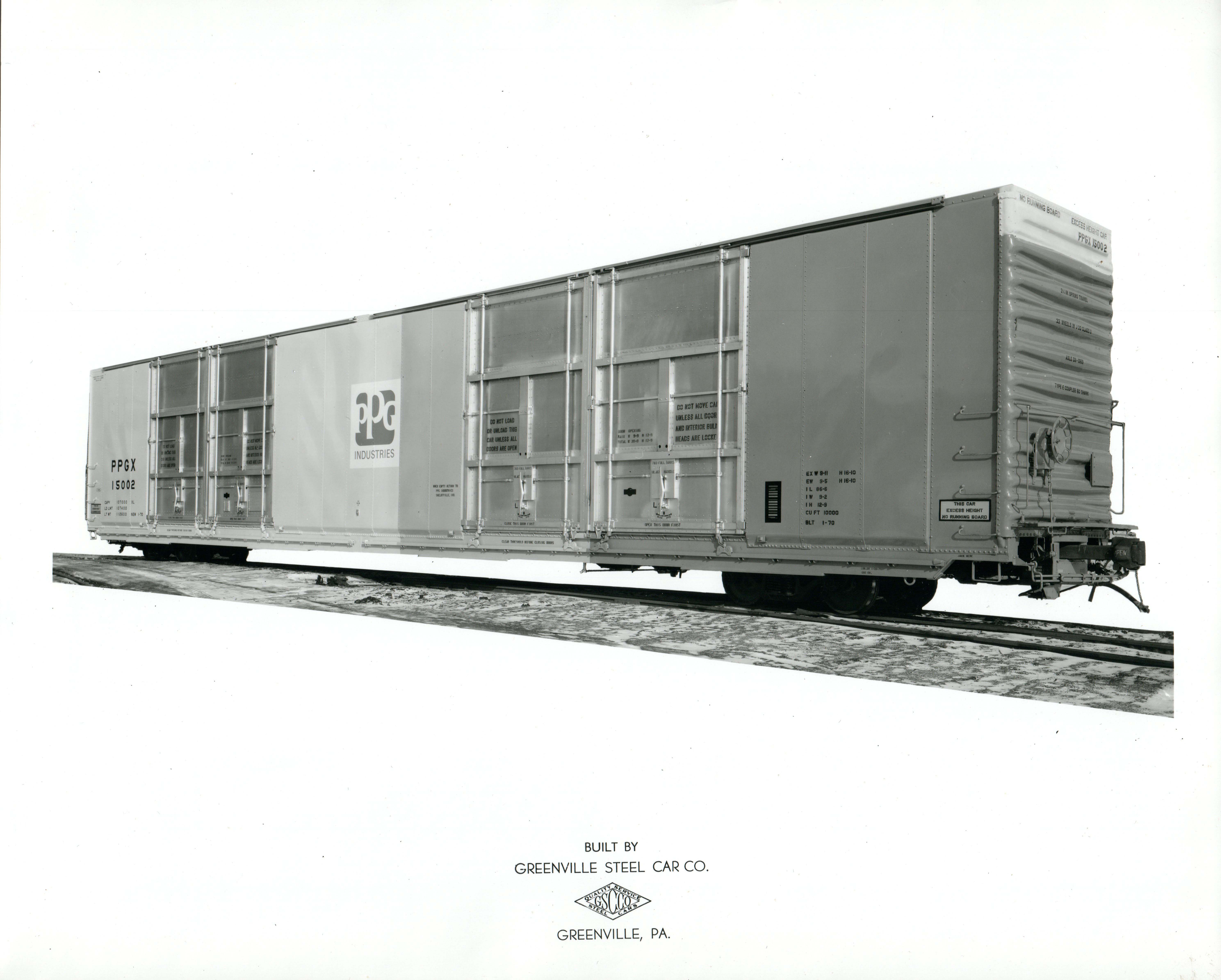 These 86'-6", 50 ton, hi-cube box cars were built by Greenville Steel Car Co. (Order 991) in 1-2/1970. They featured two sets of 2x10' doors on either side and 10,000 ft3 capacity.