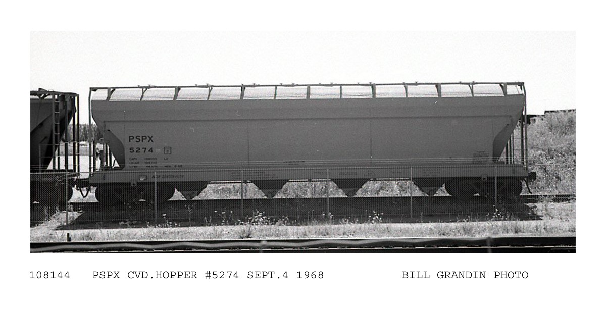 These 4-bay, 95 ton covered hopper cars were built by ACFI in 9/1966 as high-cube Center Flow CF5250 cars. They featured 5250 ft3 capacity.