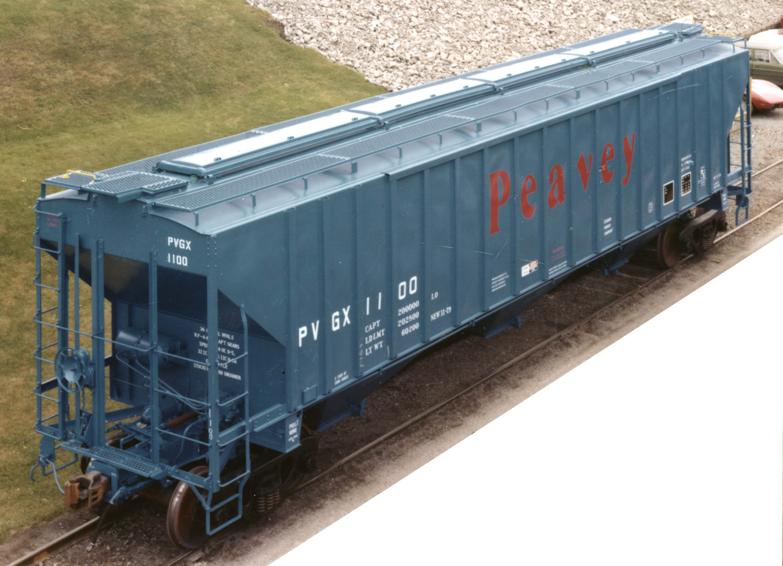 These 100 ton, 3-bay covered hopper cars were built by PS (Lot 1034) in 11/1979. They featured 4750 ft3 capacity.