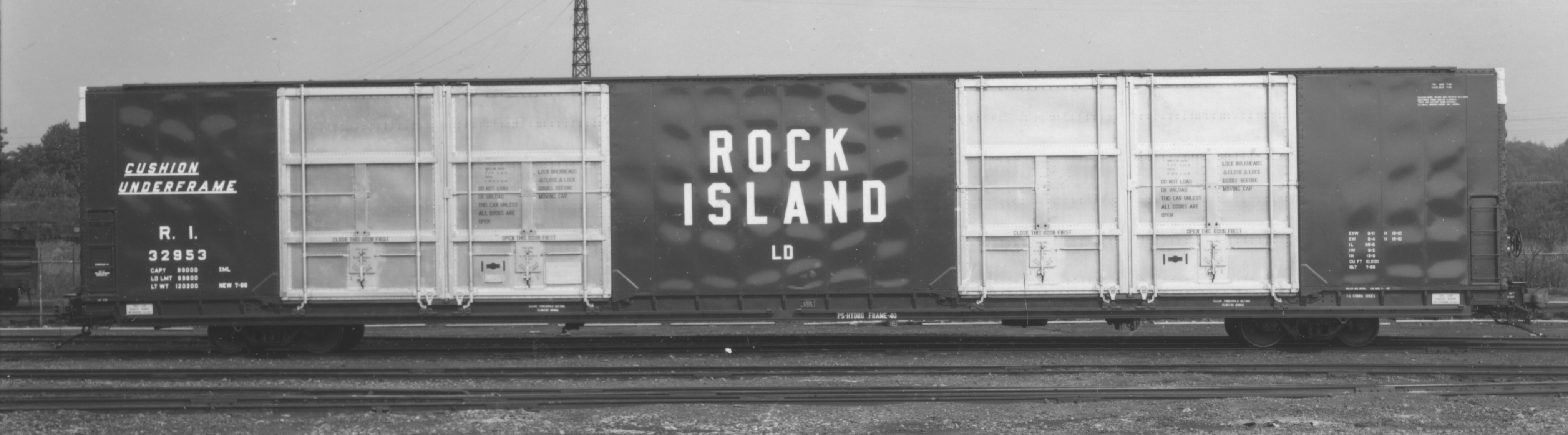 These 86'-6", 50 ton hi-cube box cars were built by PS (Lot 9106) in 7/1966. They featured 2x20' plug doors, H-40 cushioned underframes and 10,000 ft3 capacity.