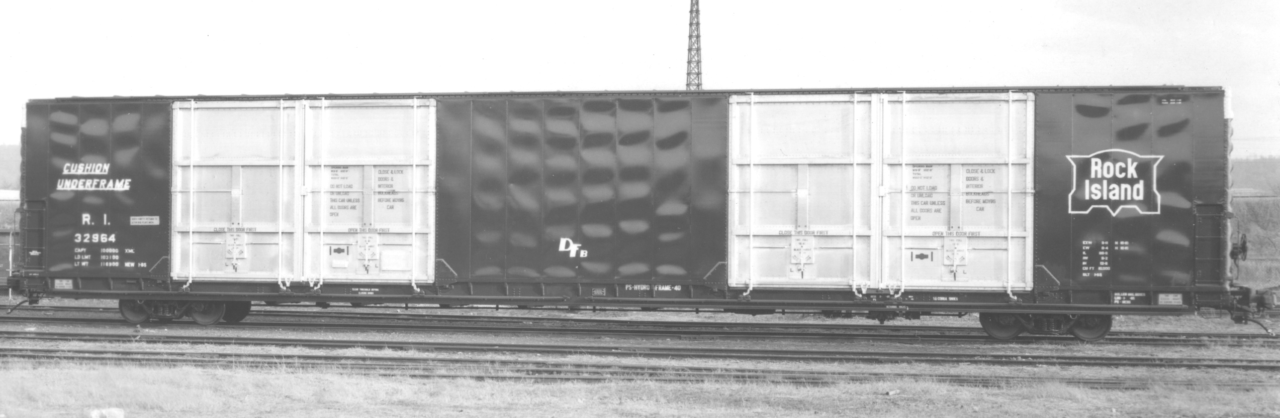 These 86'-6" box cars were built by PS (Lot 8950C) in 1/1965. They featured 2x20' plug doors, H-40 cushioned underframes and 10,000 ft3 capacity.