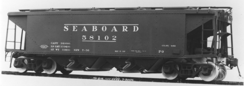These 70 ton, 4-bay covered hopper cars were built by PS (lot 5525) in 7/1936. They featured 1912 ft3 capacity and were intended for phosphate loading. They were assigned to class P-9.