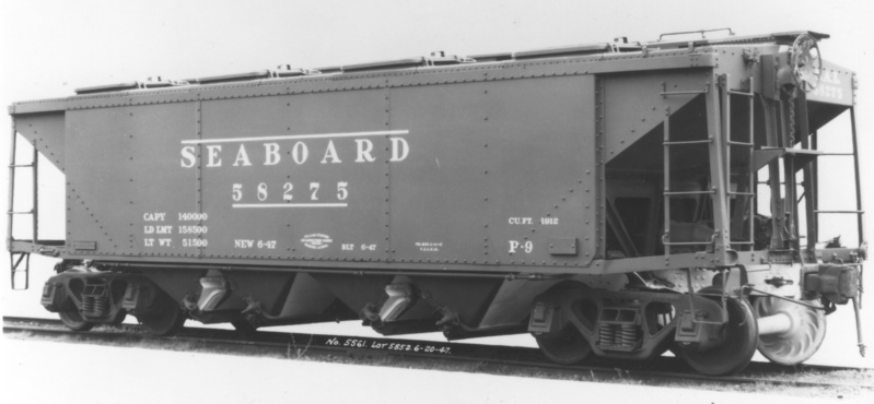 These 70 ton, 4-bay covered hopper cars were built by PS (lot 5852) in 6/1947. They featured 1912 ft3 capacity and were intended for phosphate loading. They were assigned to class P-9.