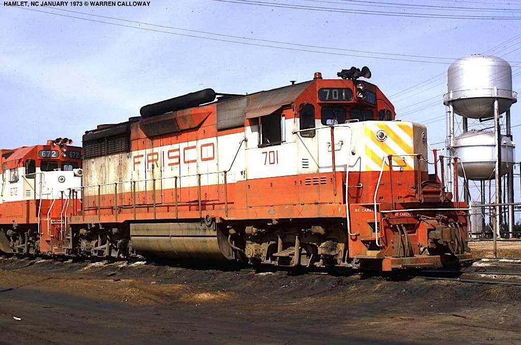 This loco was built in 3/1964 with EMD serial number 28912. She was built as a freight engine. She featured a sealed beam headlight between her number boards and on her rear end and rooftop air resevoirs for increased fuel capacity.