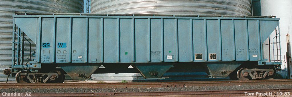 These covered hoppers were either purchased or leased by the Cotton Belt for a short period of time in the late 1970's or early 1980's. The ones I have seen have been painted light blue with a quick splash of paint over the previous initials and new SSW marks. The numbers seem to have been original with no railroad herald or marks, so they were probably privately owned cars. More info on them is certainly needed. They featured 4700 ft3 capacity.