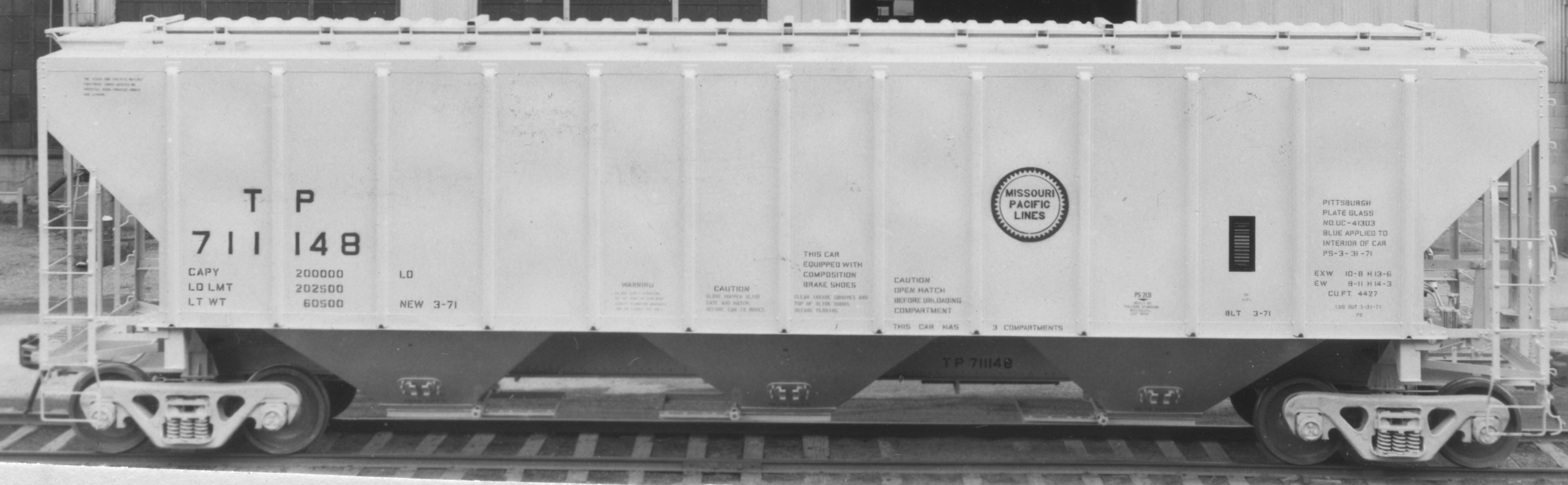 These 3-bay, 100 ton, covered hopper cars were built by PS (Lot 9544) in 3-5/1971. They featured 4427 ft3 capacity.