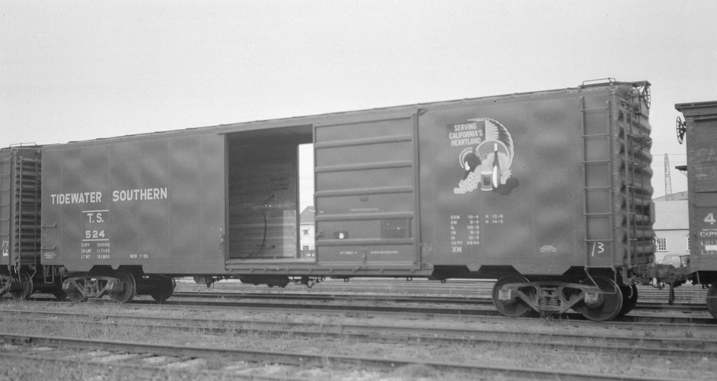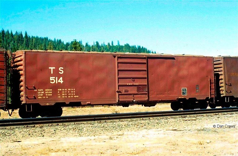The 50'-6", xx-ton box cars were built by PS (Lot 8240) in 7/1955 as PS-1s. They featured 8' sliding doors and 4844 ft3 capacity. As built, they featured the TS "cornucopia" logo to the right of the door.