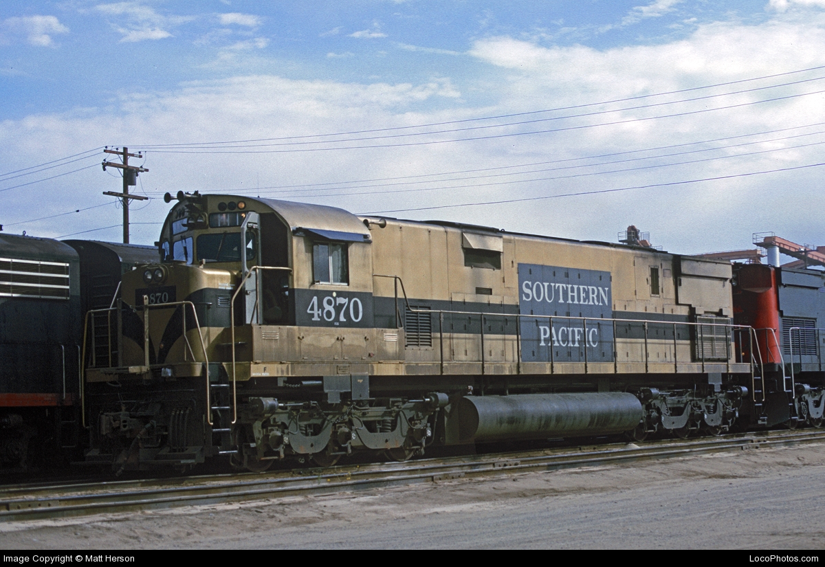 This loco was built in 5/1964 with ALCO construction number 3376-1 as one of a set of four ALCO demonstrator units. She was later purchased by the SP and assigned number SP 4870. She was built as a freight engine. She was quickly renumbered as an SP unit and ran in its as-build demonstrator scheme unti being repainted in standard for the time bloody nose colors. She featured a full 5 light headlight arrangement on the front and a single sealed beam headlight on the rear.