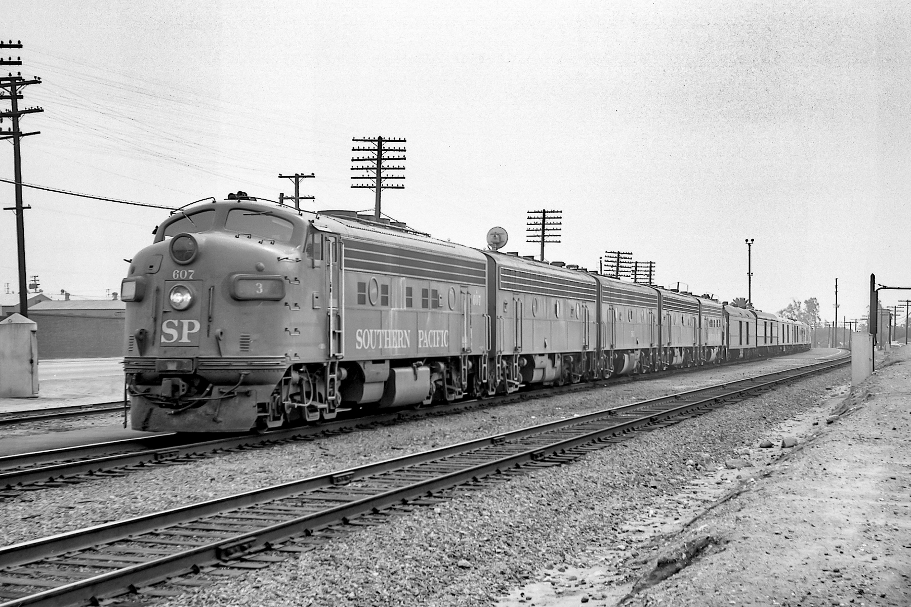 This loco was built in 10/1947 with EMD serial number 4511. She was built as a 1500 hp F3 A-unit. She was painted in the SP's standard for the time black widow colors.