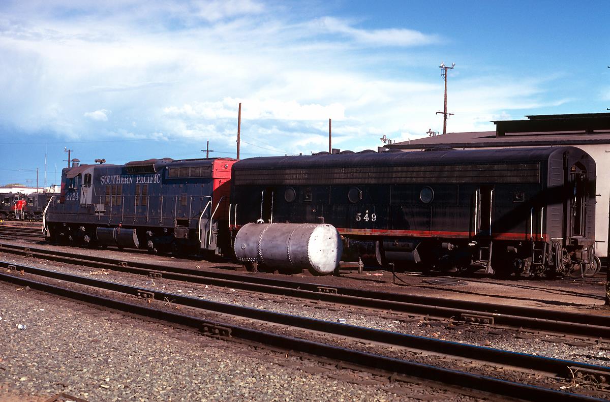 This loco was built in 06/1953 with EMD construction number 18376. It was built as a 1500 hp F7 B-unit. It was painted in the SP's standard for the time black widow colors.