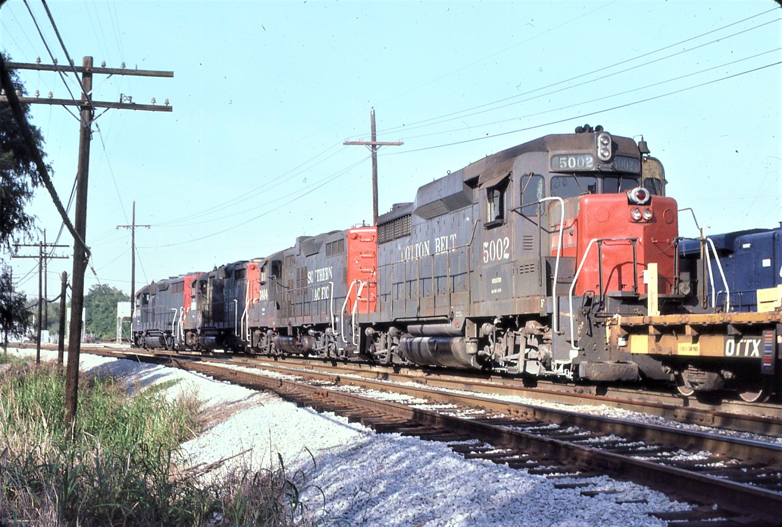 This locomotive was involved in a wreck at El Monte, CA on 04/02/01973. The damage to the unit was not enough to vacate the unit from the roster, but the resulting repairs to the rear of the long hood resulted in a non-standard appearance compared to that of the other members of the SP/SSW GP30 fleet. The rear gyralight/UDE and vertical bracket were done away with and a rear headlight arrangement more in line with off the shelf GP30's and the SP/SSW fleet of GP35's was applied. Thus, this unit became a unique GP30 by becoming more standard. Also, upon emerging from Taylor shops for repairs from the same wreck, an SP was placed on the nose where SSW units were having their road number placed making this unit even more oddball. In later years, the SP was painted out, but the road number was not applied. Thanks to Ryan Martin for posting these details.