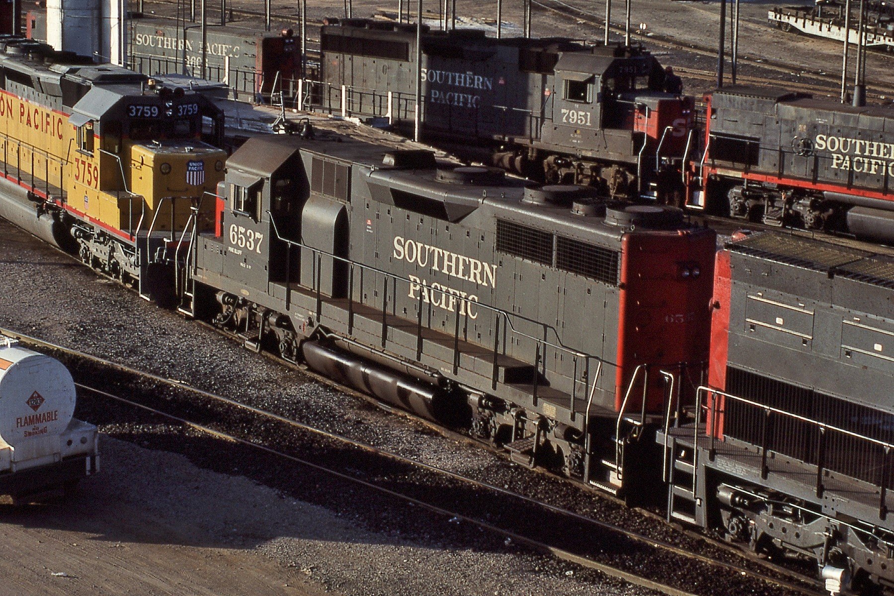 This loco was built in 1/1964 with EMD construction number 28479. She was built as a freight engine. She was painted in standard for the time bloody nose colors and featured a full 5 light headlight arrangement on the front end. The rear featured a dual sealed beam light only.