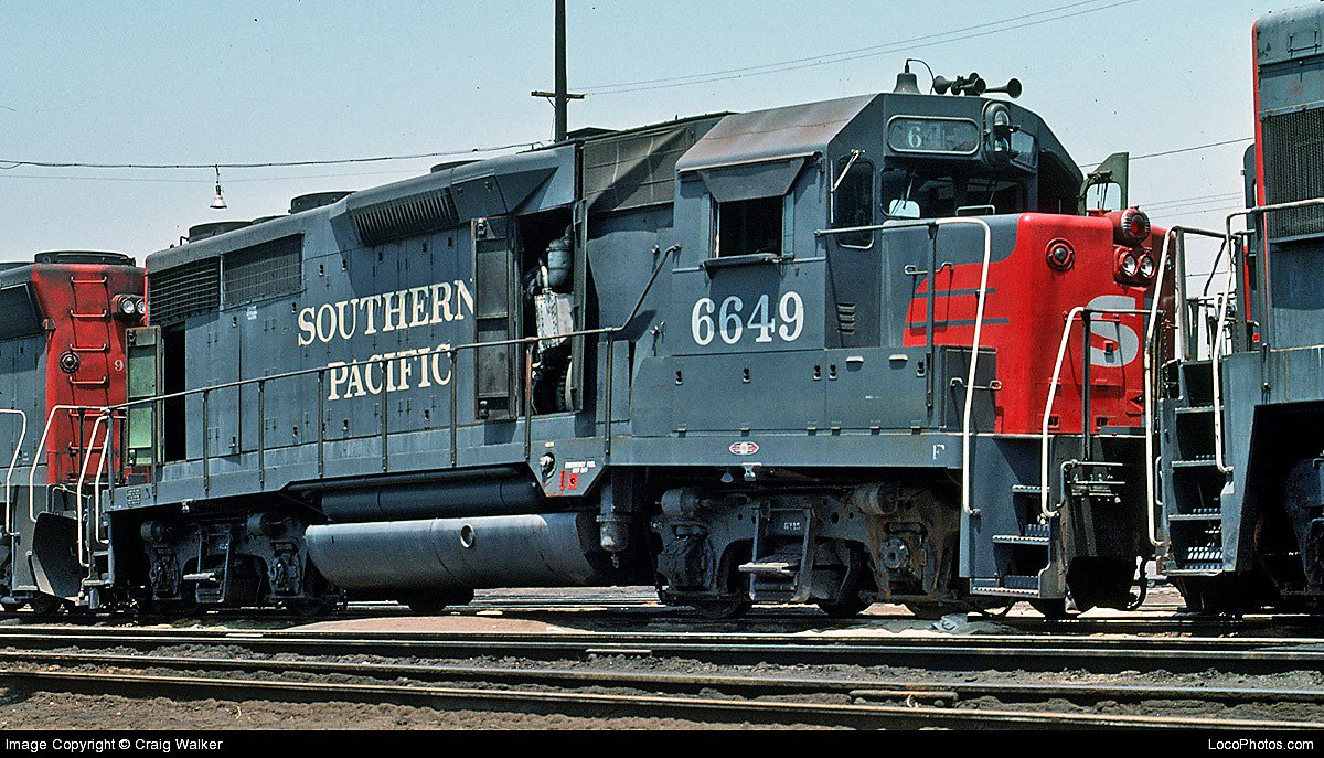 This loco was built in 6/1965 with EMD construction number 30159. She was built as a freight engine. She was painted in standard for the time bloody nose colors and featured a full 5 light headlight arrangement on the front end. The rear featured a dual sealed beam light only.
