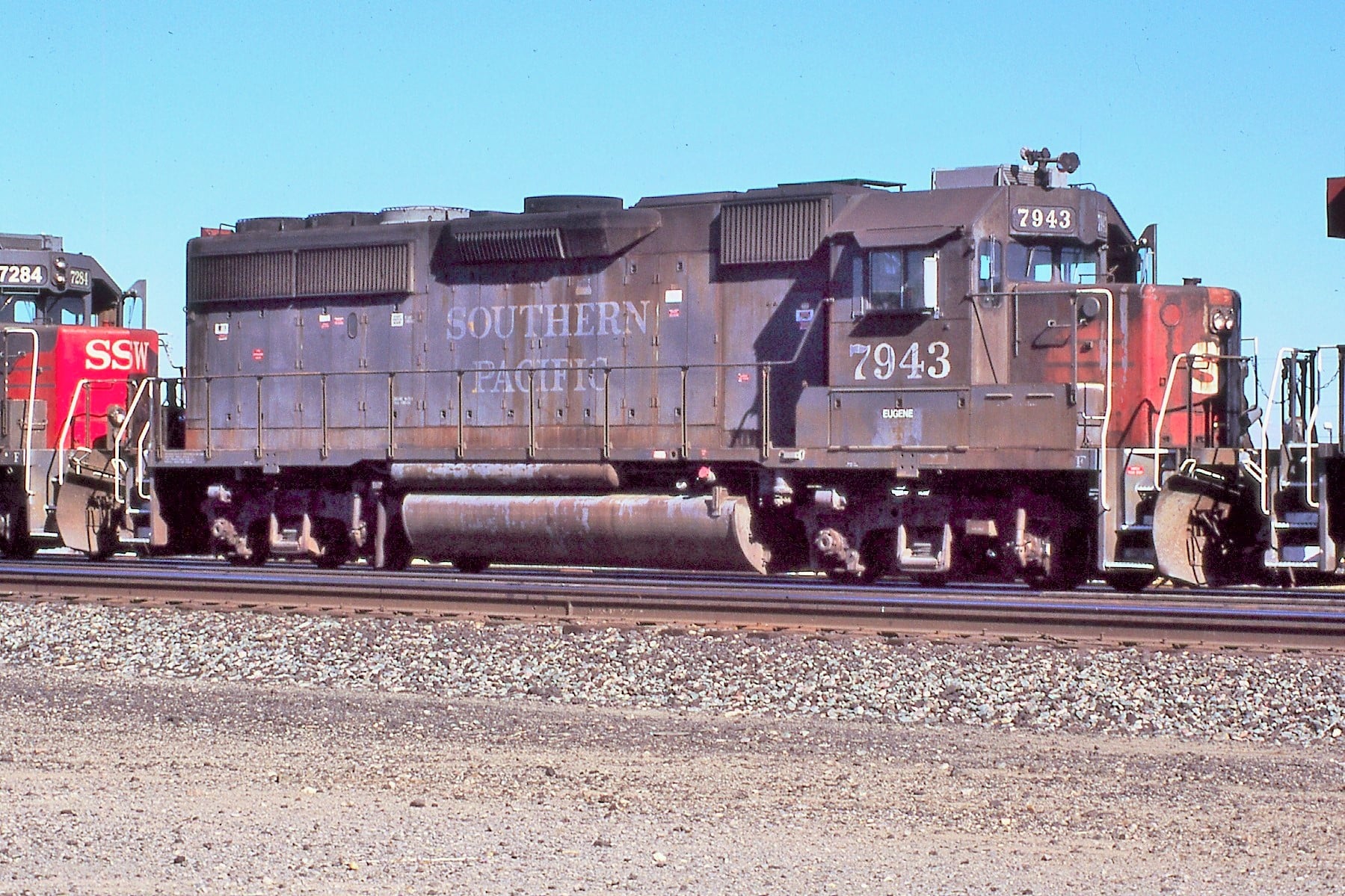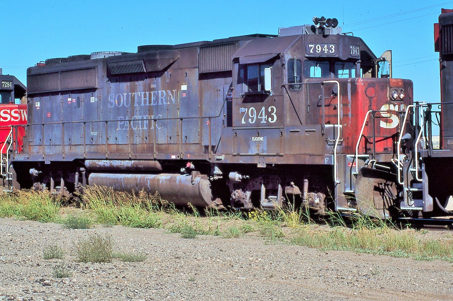 This loco was built in x/1980 with EMD serial number 796354-4. She was built as a freight engine. She was painted in standard for the time bloody nose colors and featured large front plow, anticlimber, cab-roof air conditioner and a full 5 light headlight arrangement on both the front and rear end. She was built to be a mother unit to SP's TEBU road slugs.