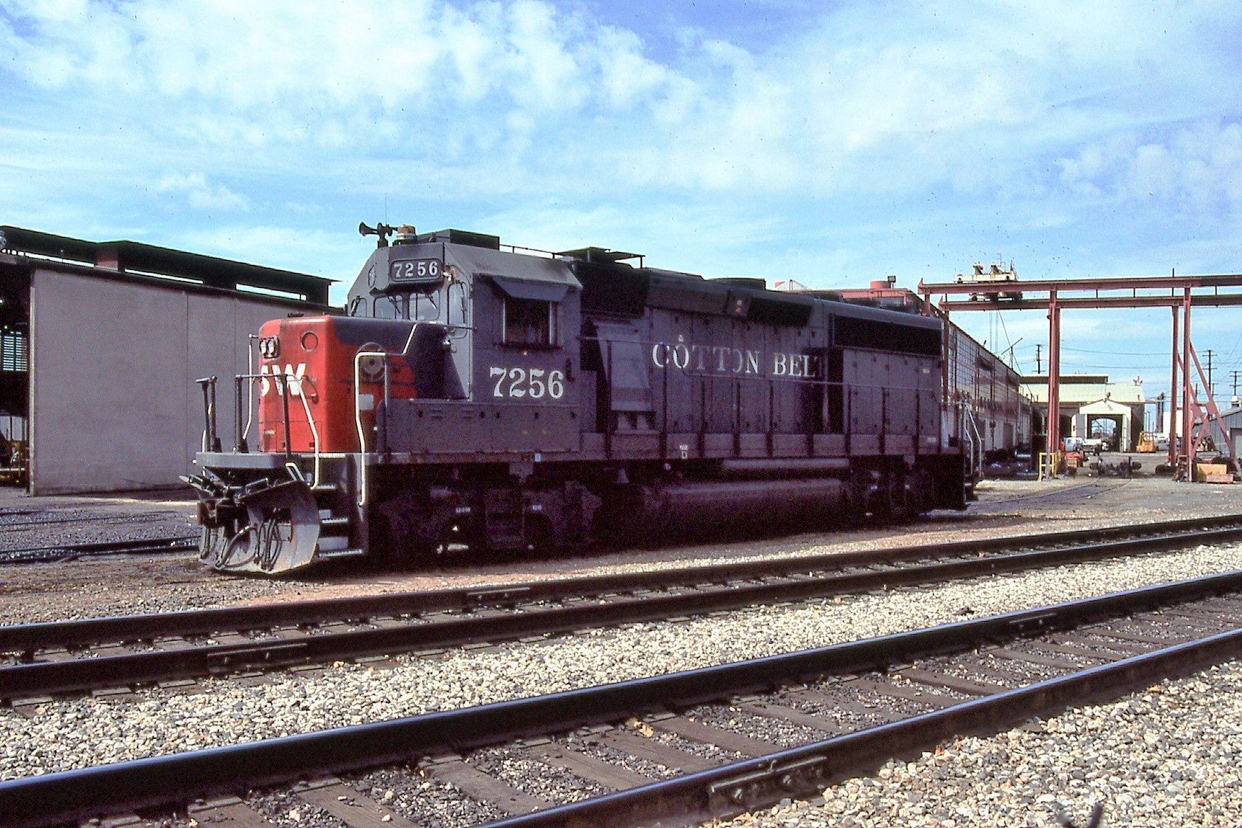 This loco was built in xx/1984 with EMD construction number 847046-9. She was built as a freight engine. She was painted in standard for the time bloody nose colors and featured large front plow, anticlimber, cab-roof air conditioner and a full 5 light headlight arrangement on both the front and rear end featuring Oscitrol oscilating headlights vs. the previous SP standard Gyralight.