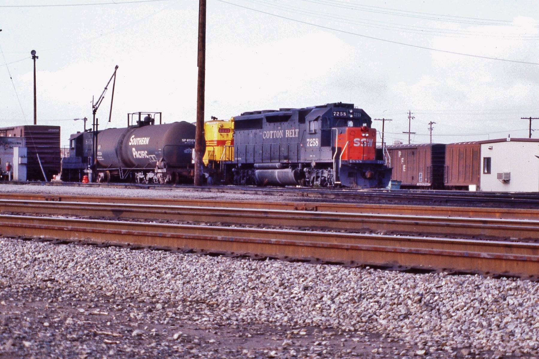 This loco was built in xx/1984 with EMD construction number 847046-11. She was built as a freight engine. She was painted in standard for the time bloody nose colors and featured large front plow, anticlimber, cab-roof air conditioner and a full 5 light headlight arrangement on both the front and rear end featuring Oscitrol oscilating headlights vs. the previous SP standard Gyralight.